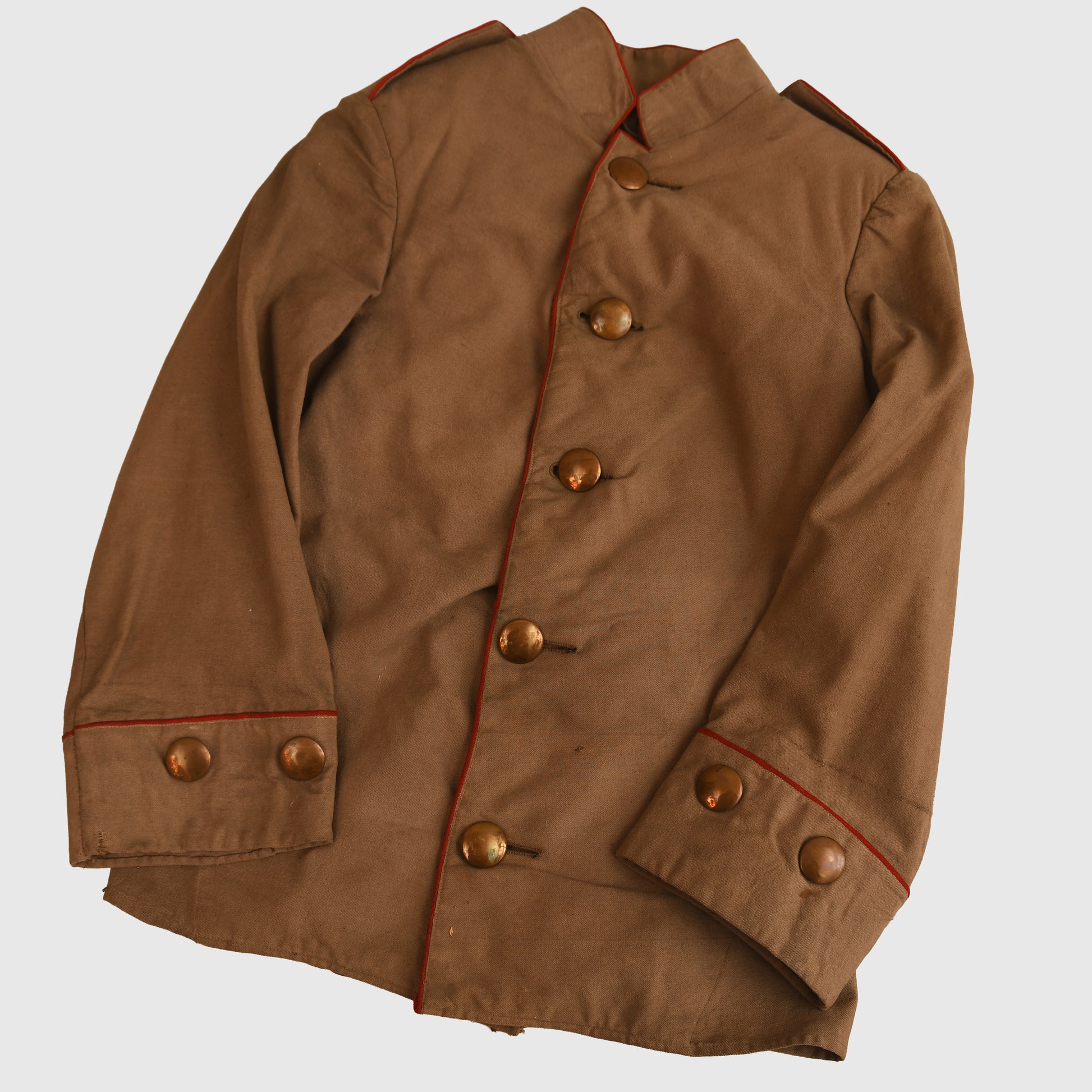 A charming and well-preserved large child’s size M.1910 field grey tunic. Features Swedish cuffs piped in red, matching 1907 pattern shoulder boards, and red piping to the collar and front skirt. Retains all five original brass buttons. The interior is neatly skeleton-lined with an internal pocket. Complete with the correct skirted back and belt support buttons. A delightful and authentic miniature example of the Imperial German soldier’s tunic.