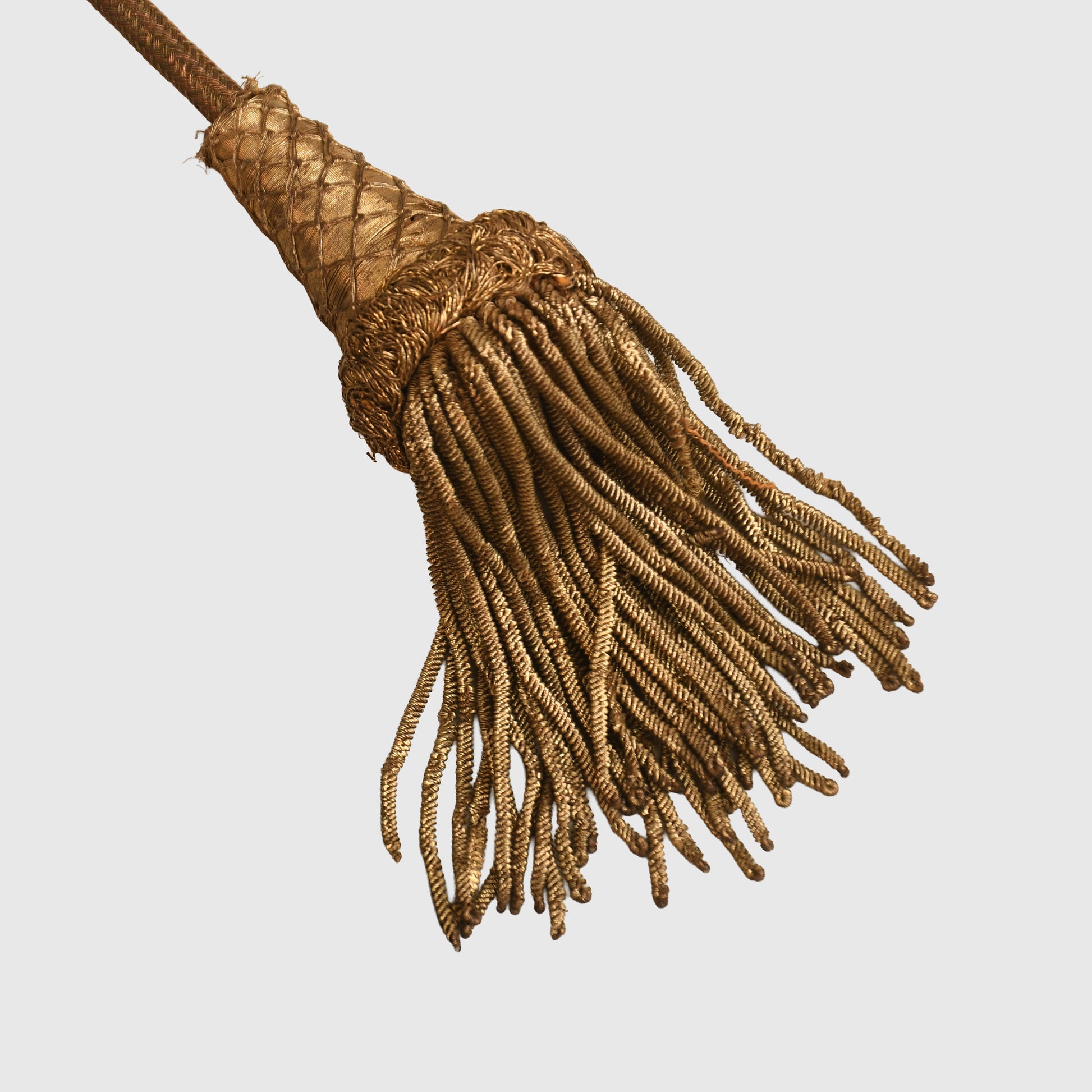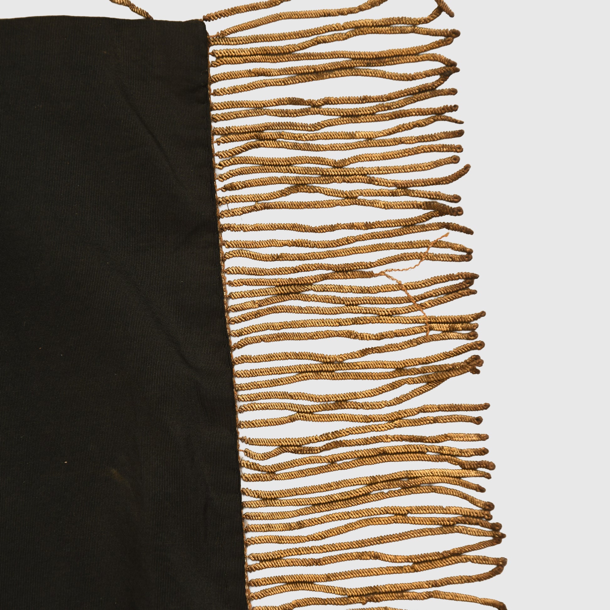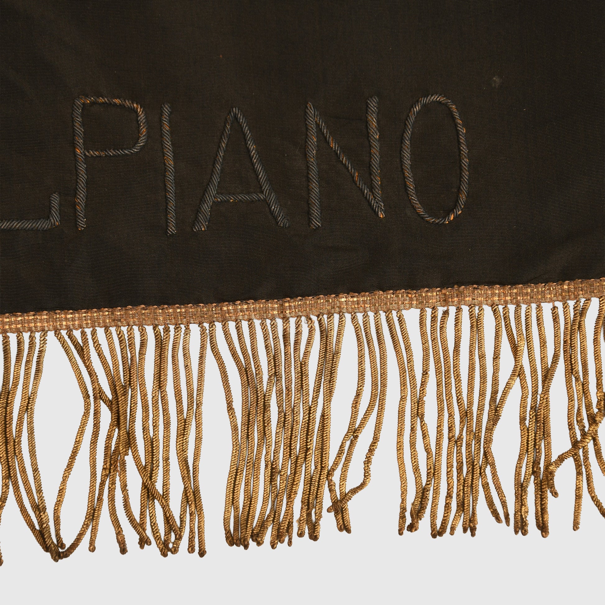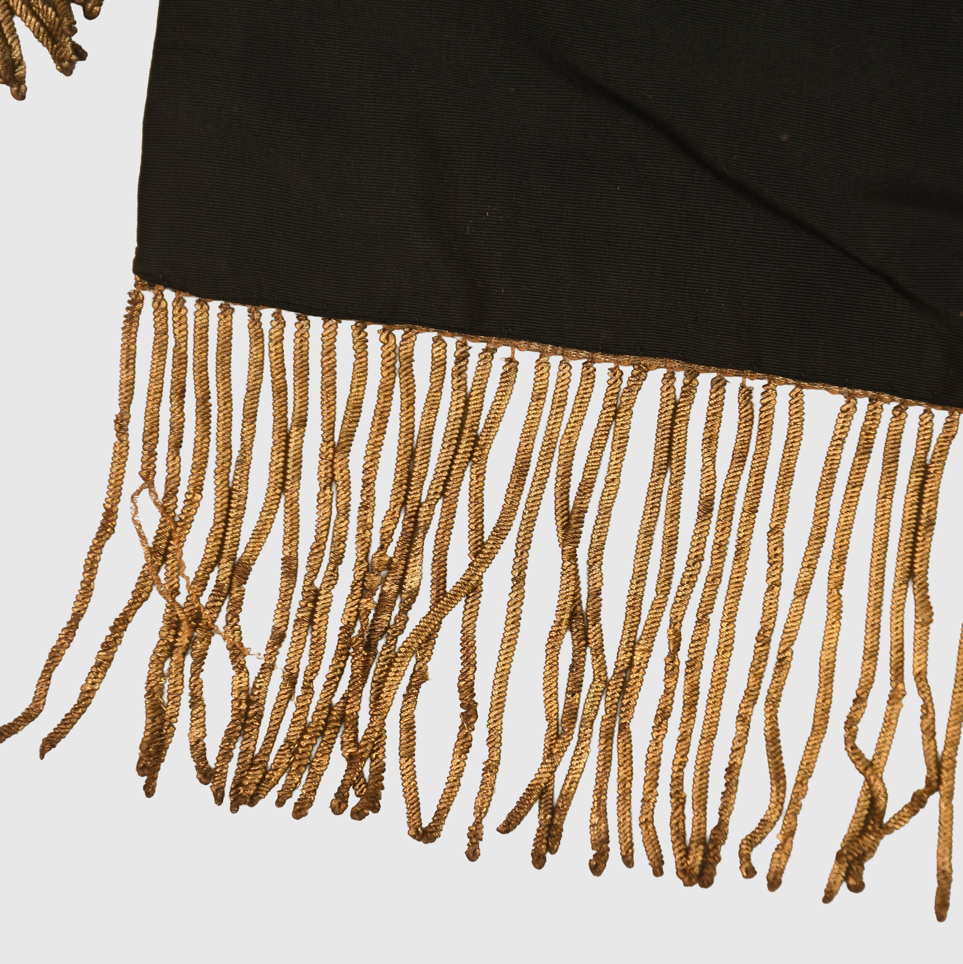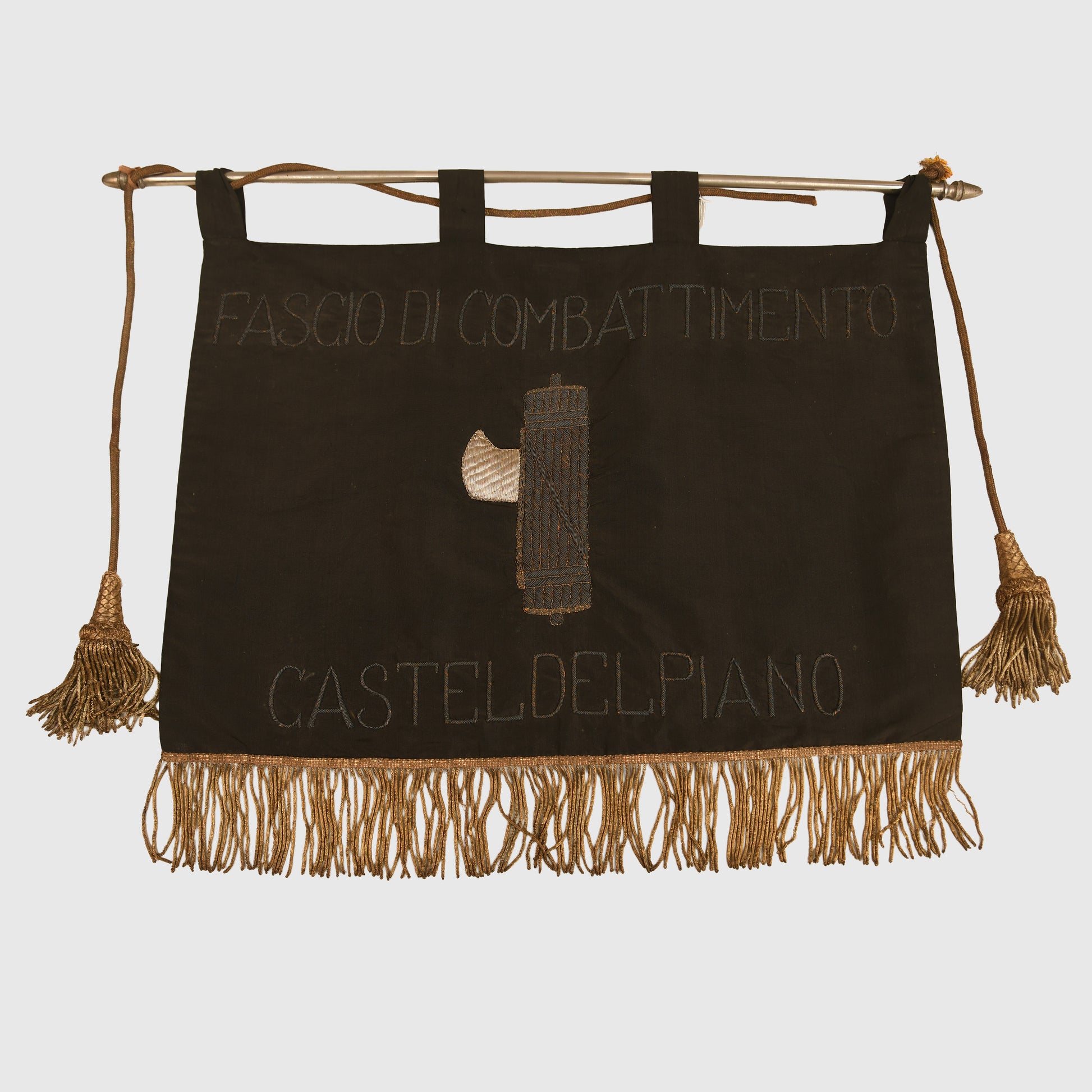 The banner is constructed from high-quality black silk which remains in excellent condition. It is still attached to its original wooden carrying pole and retains its original side hanging tassels and gold-fringed base. The central feature is the Fascist insignia applied in a faded gilt finish. Above the insignia, the text reads Fascio Di Combattimento, while the gold embroidery below identifies the specific location as Castel di Piano.