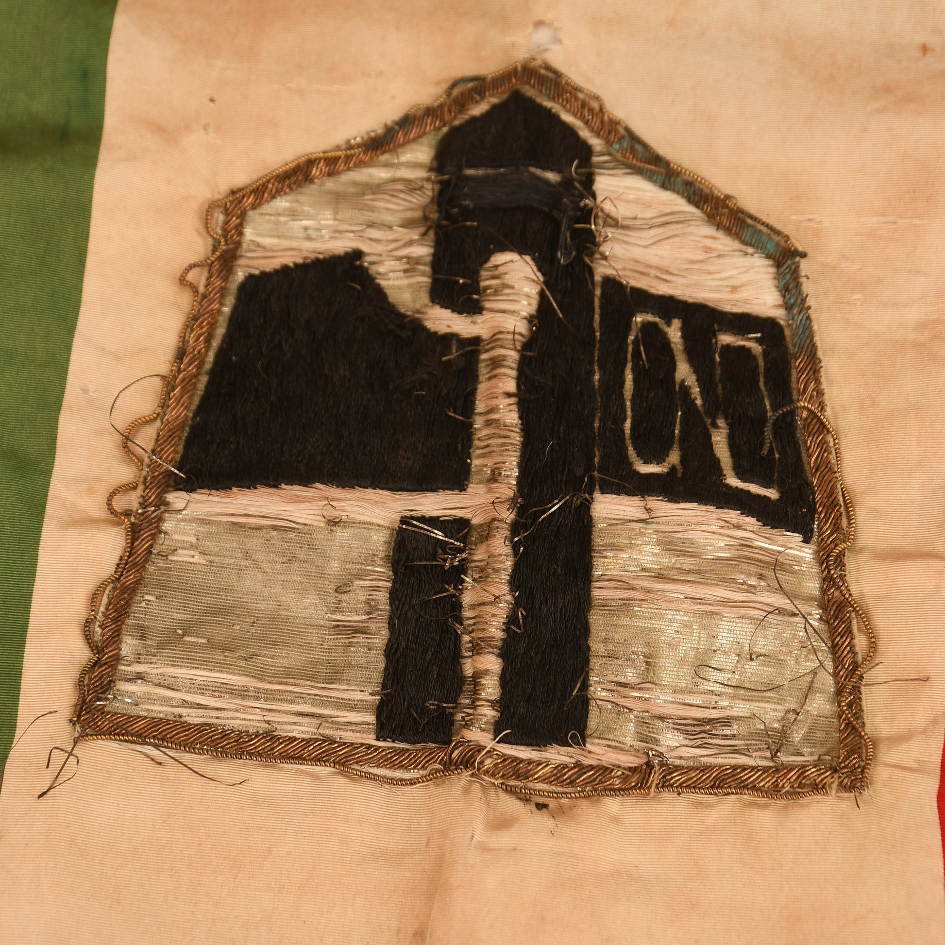 This is a silk banner representing the Opera Nazionale Dopolavoro (OND), the national organization for sports and culture in Italy. The piece is constructed in the national colours of red, white, and green, featuring detailed Italian embroidery characteristic of the period.