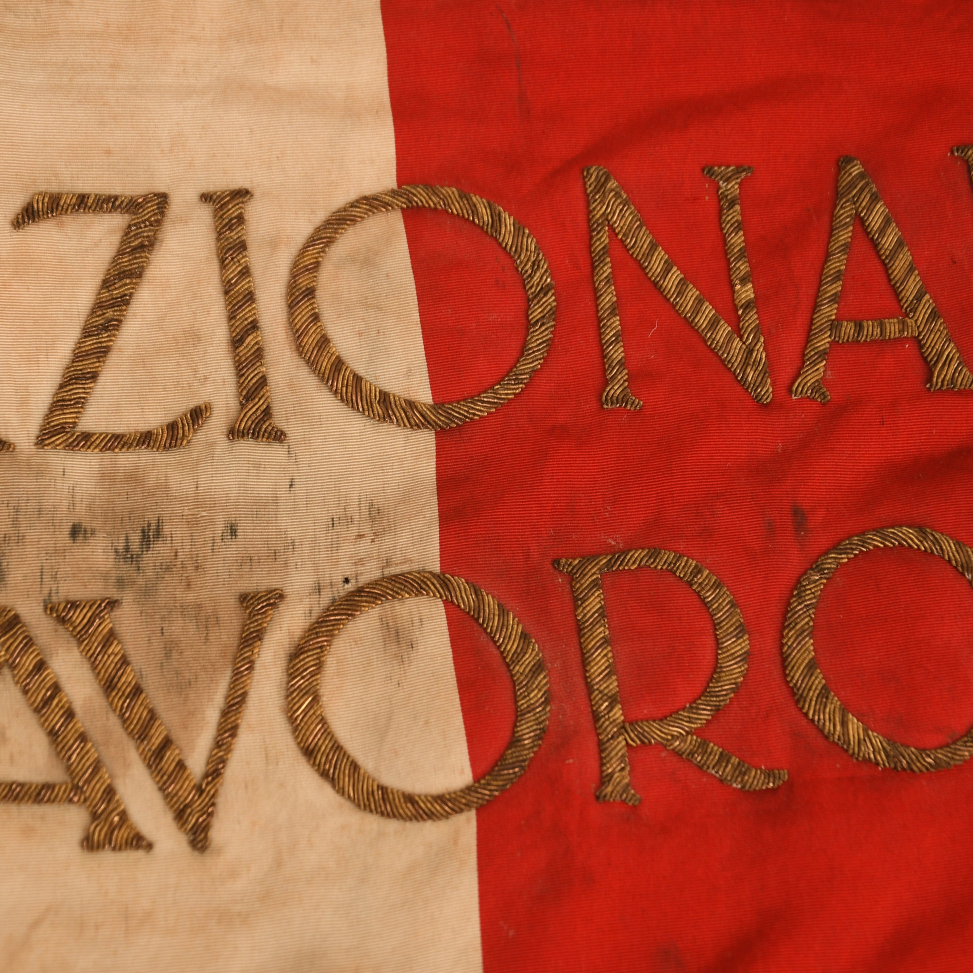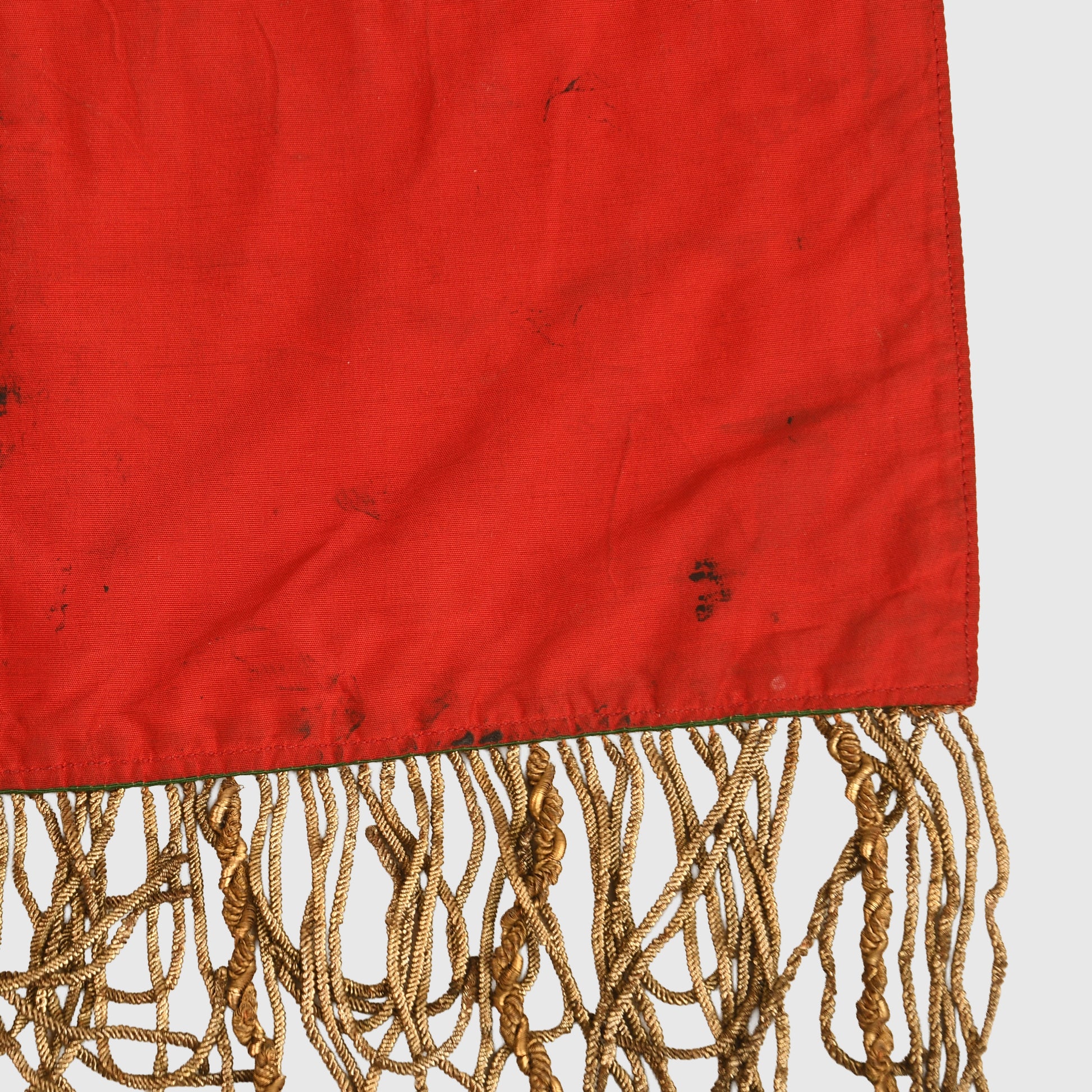 The centre of the banner displays the fascist emblem, with the embroidered text Dopolavoro Provinciale Pesaro located below. The silk on the central emblem shows some slight shredding, and the white silk section at the base of the central area is slightly shot. There are a few minor moth nips and a stain located between the two rows of lettering at the top. The banner is finished with a gold fringe and multi-coloured loops for pole suspension.