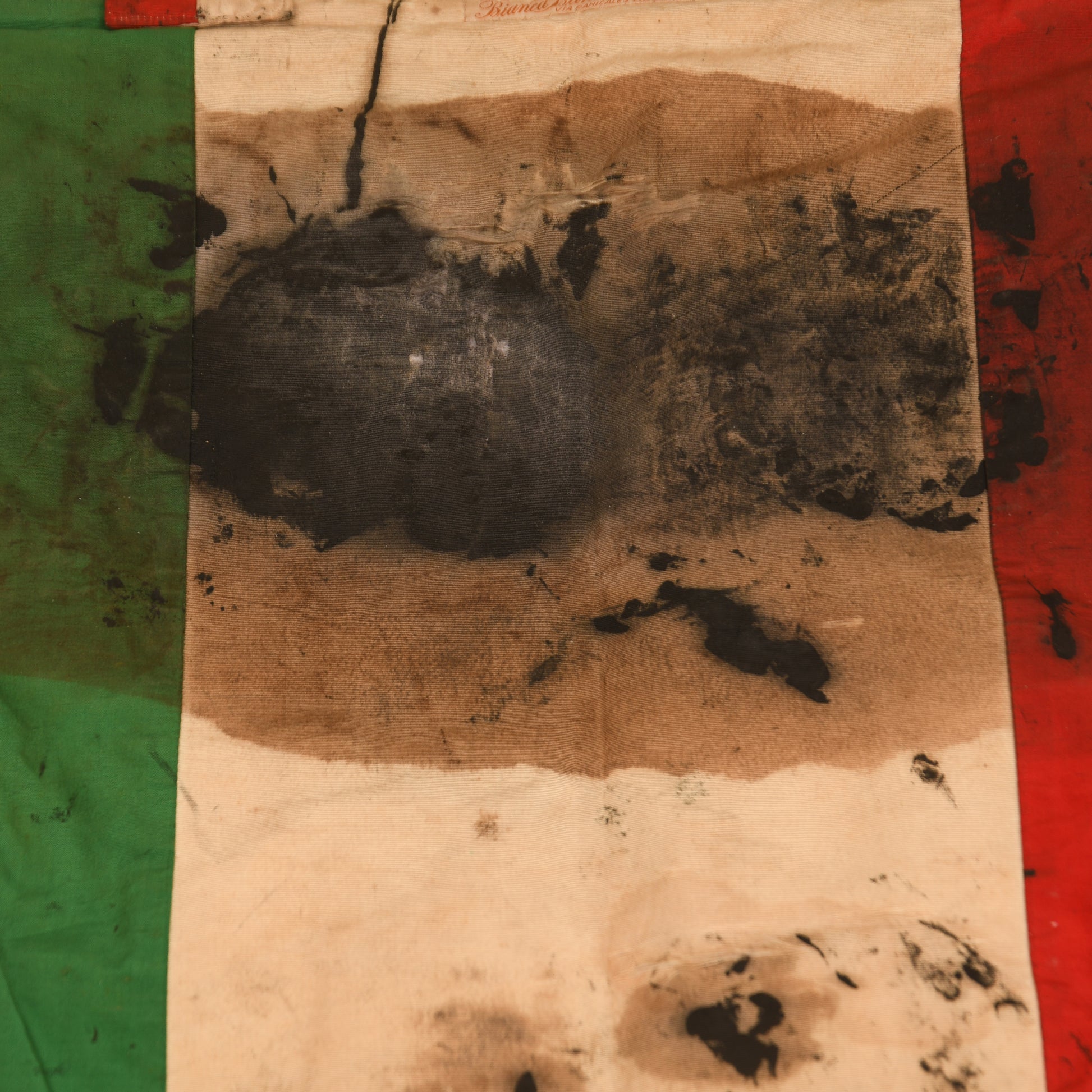 The reverse side retains a manufacturer label from a banner producer in Florence. Below this label, there is heavy staining on the reverse, likely caused by contact with a suspension pole during its period of use. This is a significant piece of social and political history from the provincial administration of Pesaro.
