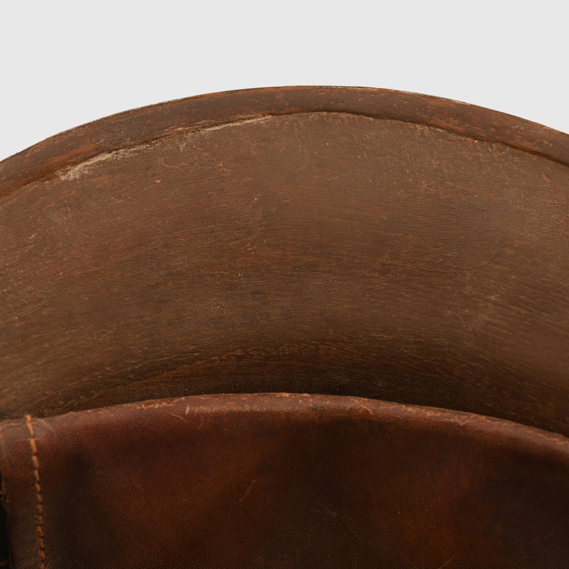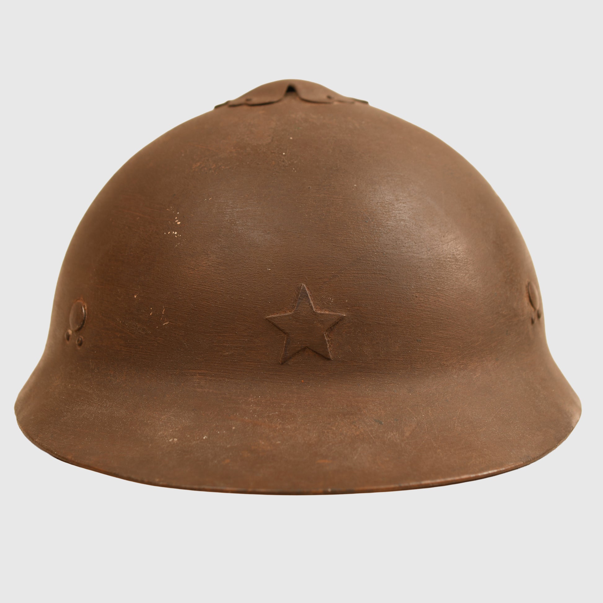 A highly desirable and extremely rare Japanese Cherry Blossom combat helmet, one of the most difficult WWI helmets to obtain. This army-issue example features the star front and the distinctive crown air vent, with three rivets securing the inner liner and two additional lower rivets. The helmet retains virtually all of its original Japanese paint finish. The interior is complete with its leather liner band, three-pad liner with fully intact padding, and original long webbing chin cord. A superb example of an iconic early Japanese combat helmet.