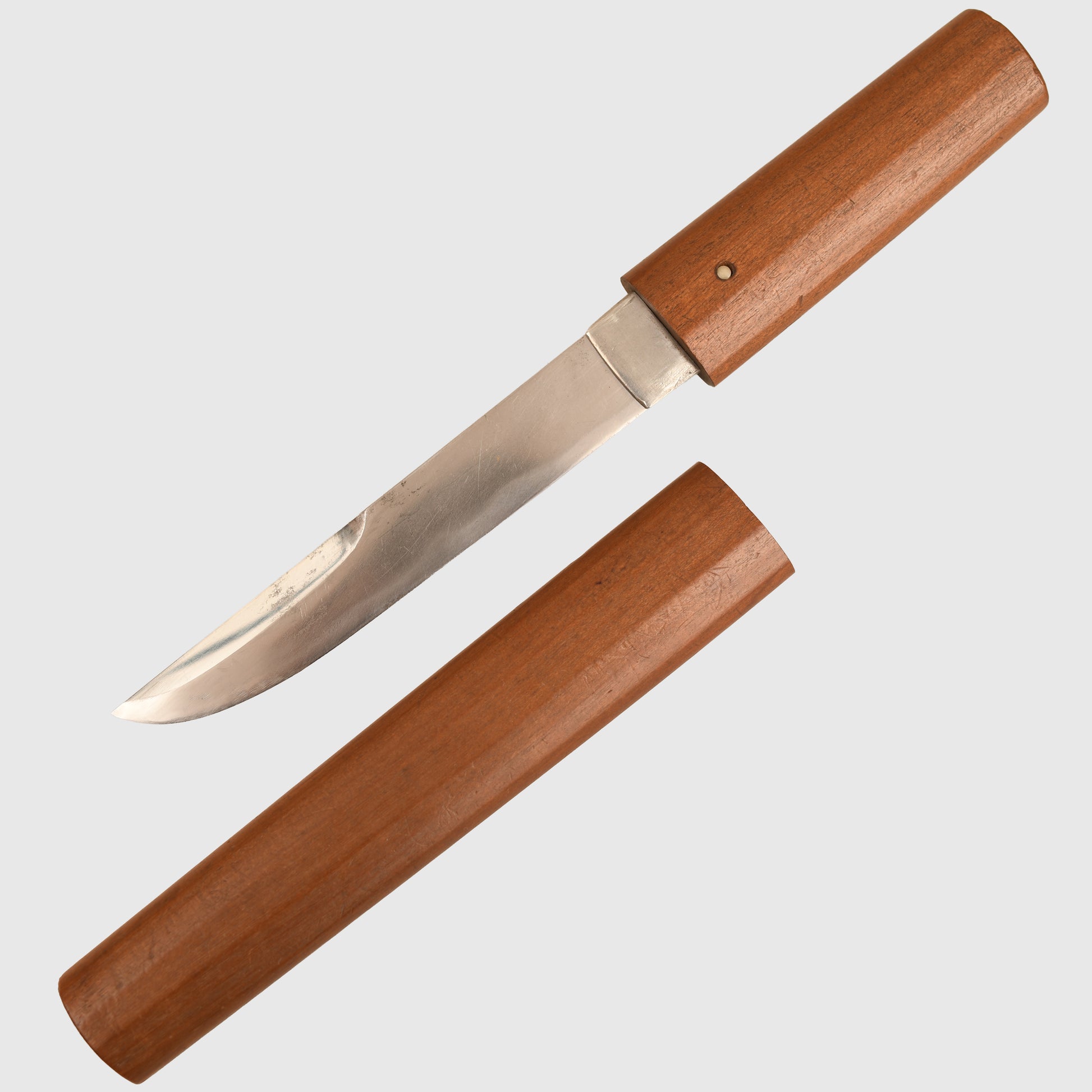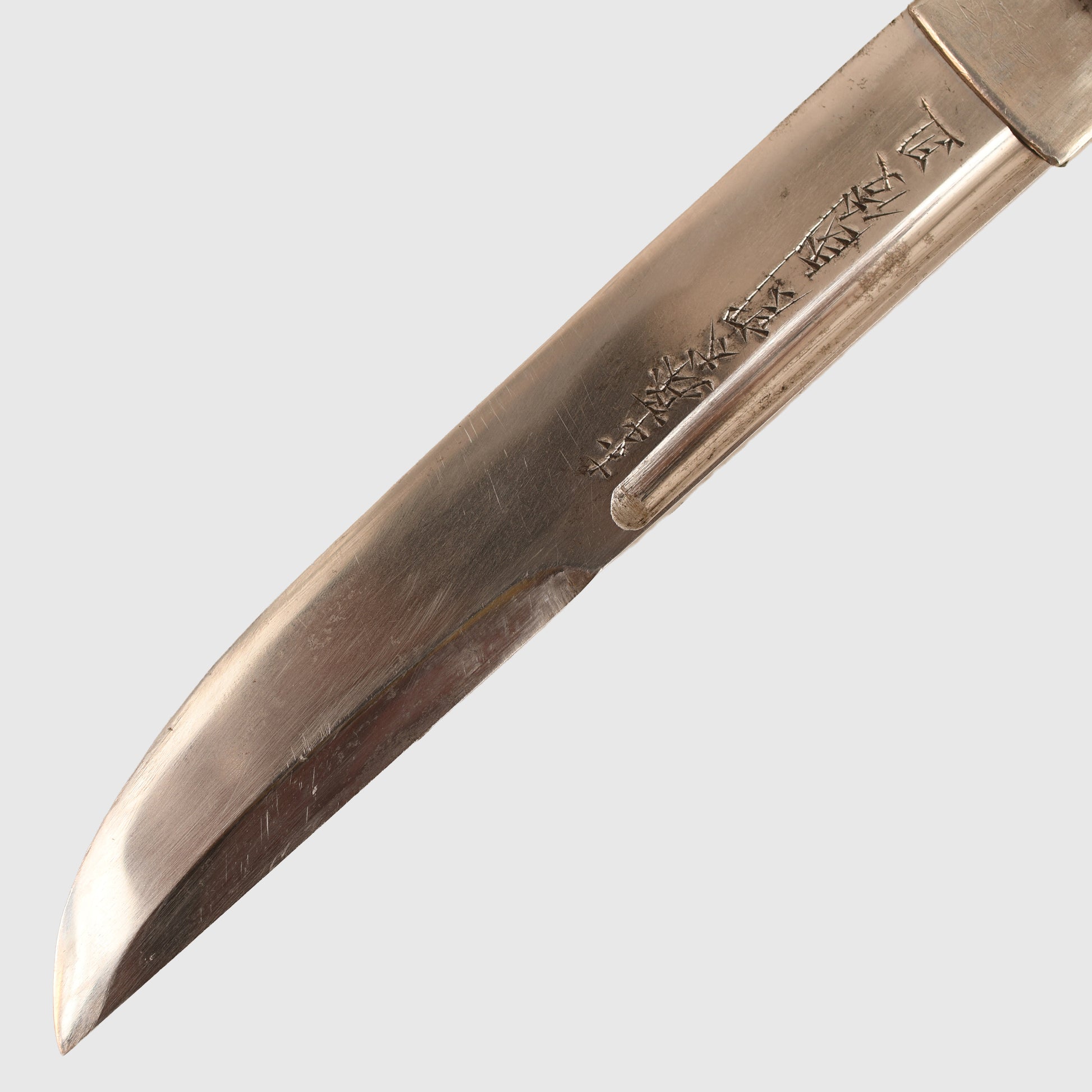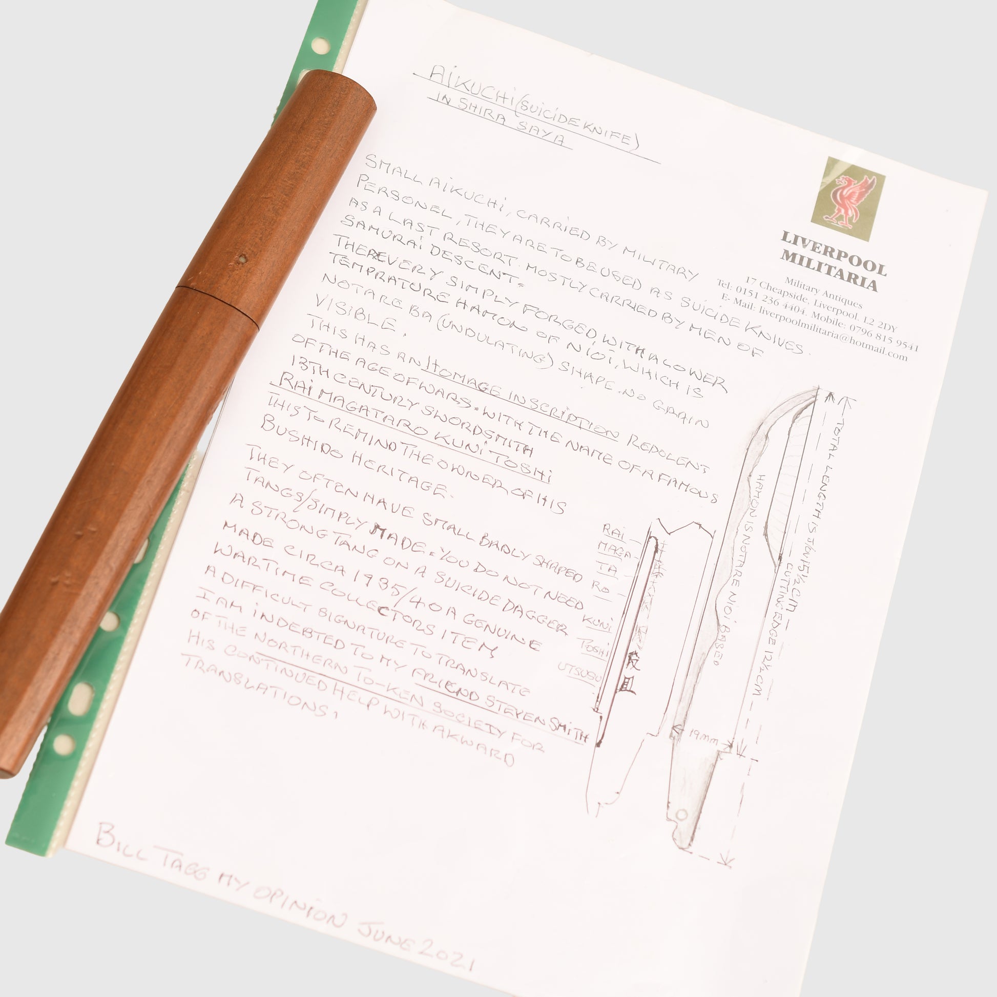 A small, beautifully crafted blade with Japanese kanji markings, which is the name of the famous 13th-century swordsmith. Nice wavy hamon. Total length of the blade is 15.5cm. Fitted into its wooden scabbard. Accompanying the dagger is a very nicely handwritten description of the dagger by the well-known Japanese sword dealer William Tag of Liverpool Militaria.