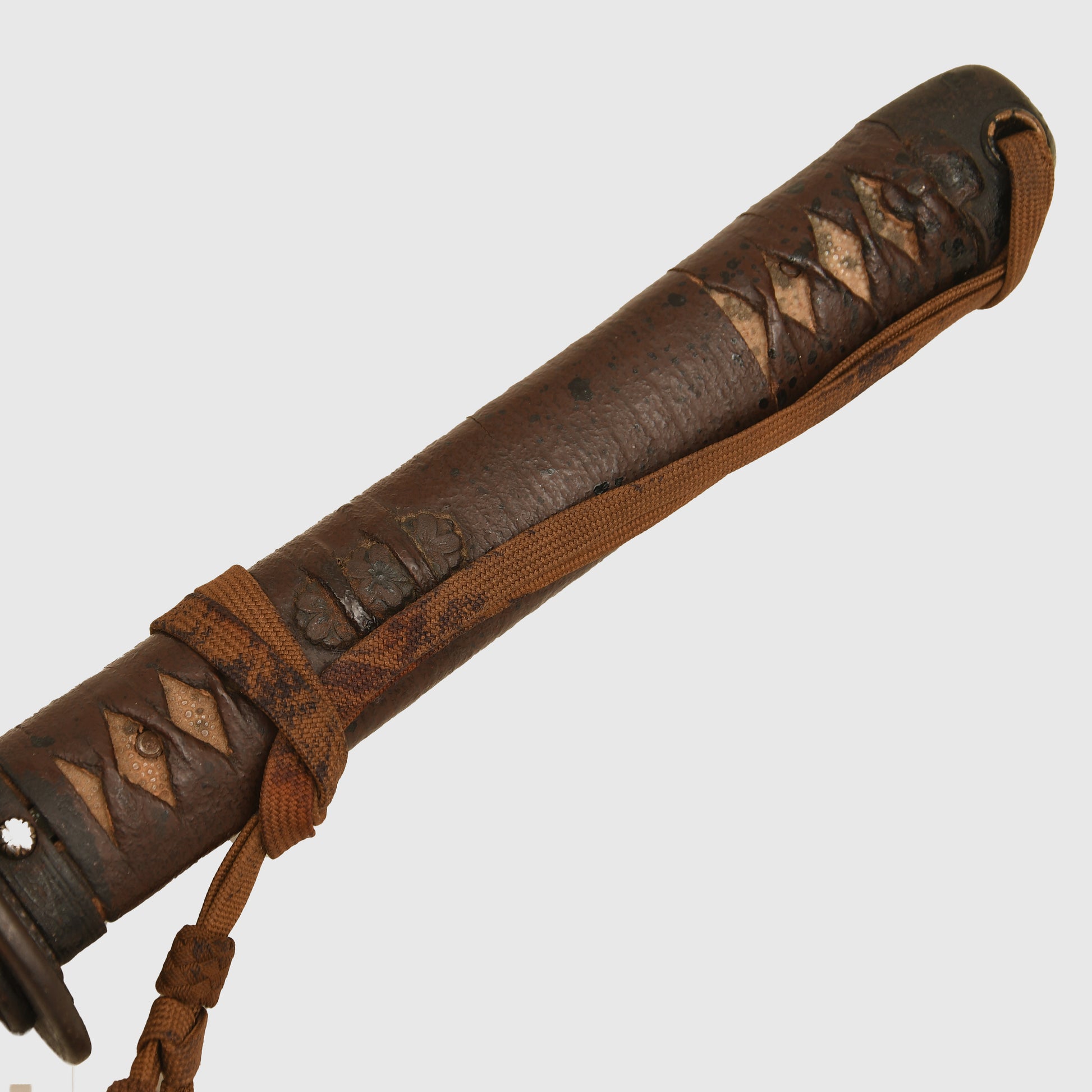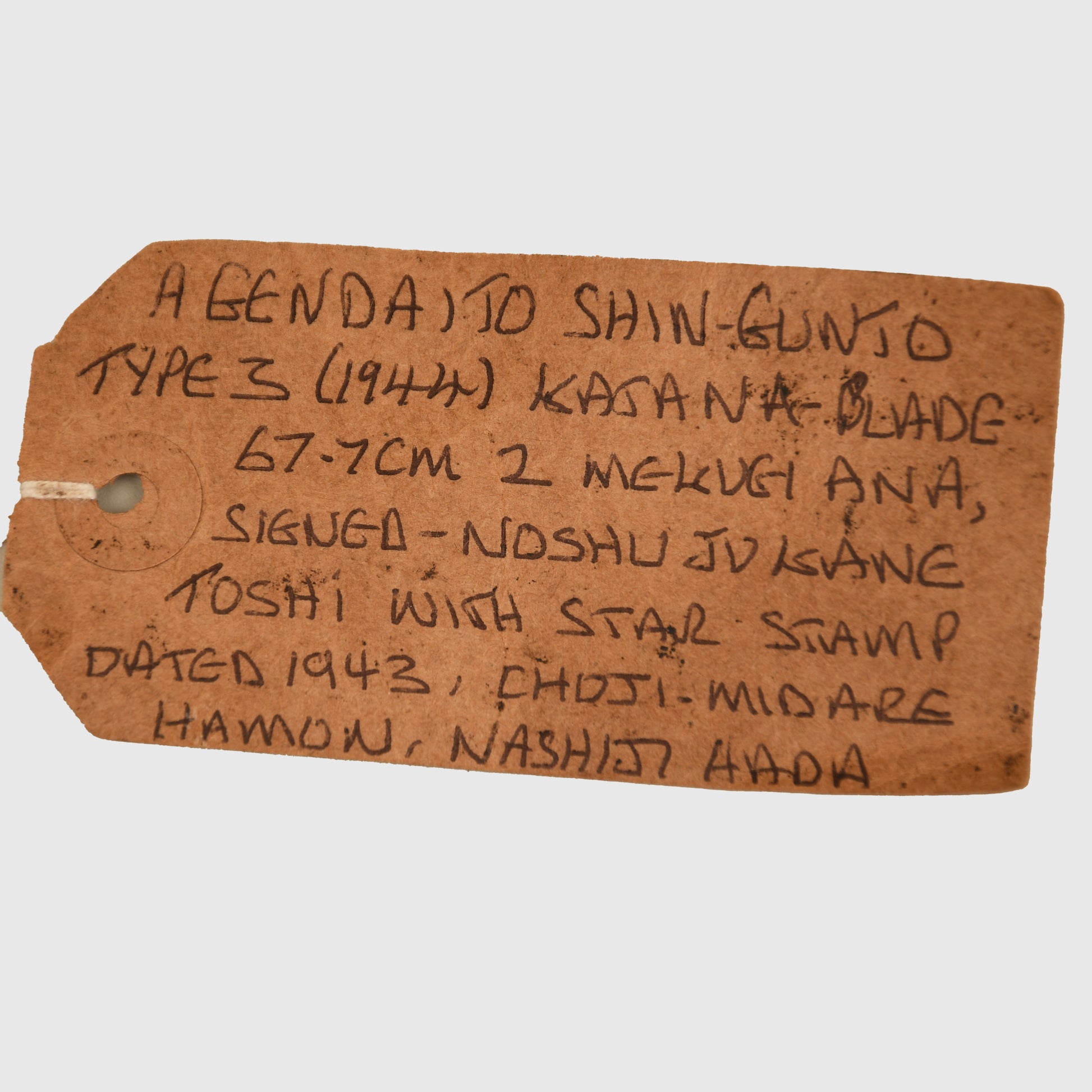 A superb example of the Type 3 RJT officer’s display piece, featuring a 1944 pattern construction with exceptional quality and presence. The core element is signed Noshu Ju KaneToshi, accompanied by a star stamp and dated 1943. A striking hamon is clearly visible, adding to its visual appeal.