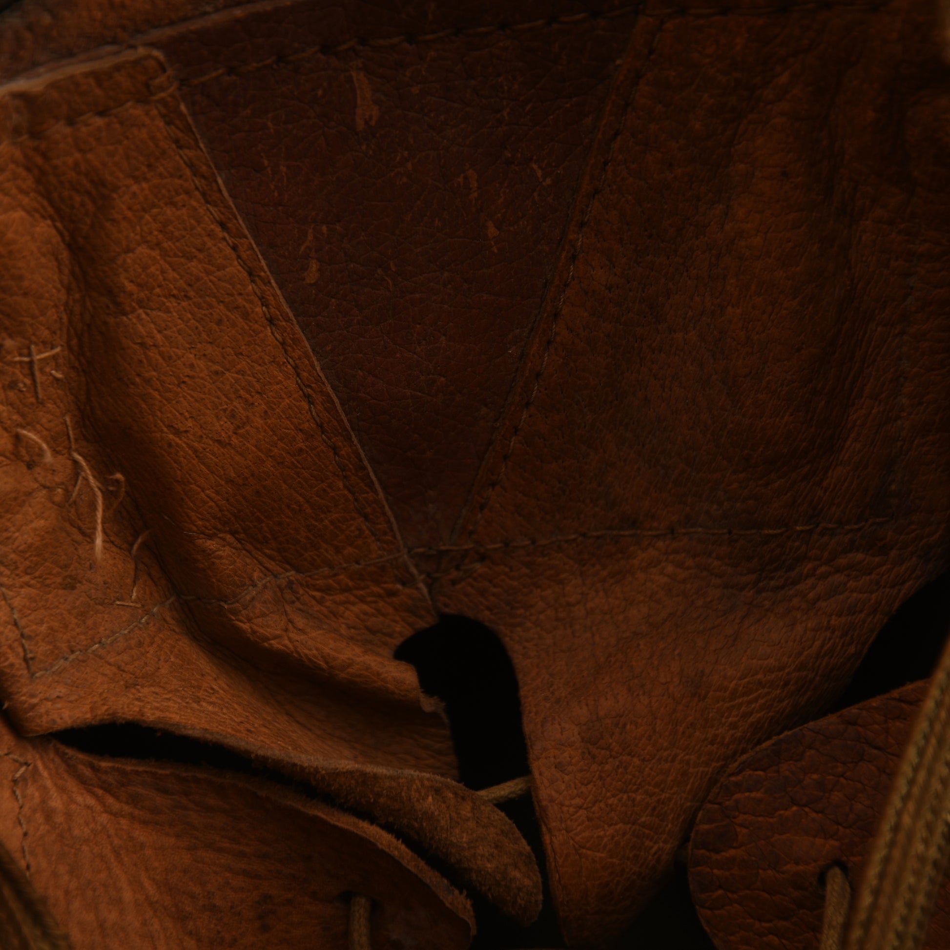 The interior rear skirt bears a single Kanji character denoting size. The liner is fully intact and in good condition, constructed from multiple shades of tan leather in a triangular patchwork fashion — a characteristic feature of 1941 production, when liners were made from leftover factory materials. Behind the front liner pad is an ink block stamp with Japanese characters. The helmet retains its original drawstring, with all three liner pads present — two still containing their inner cushions, one now missing. The full-length neck tie tapes remain, reinforced with period stitching.