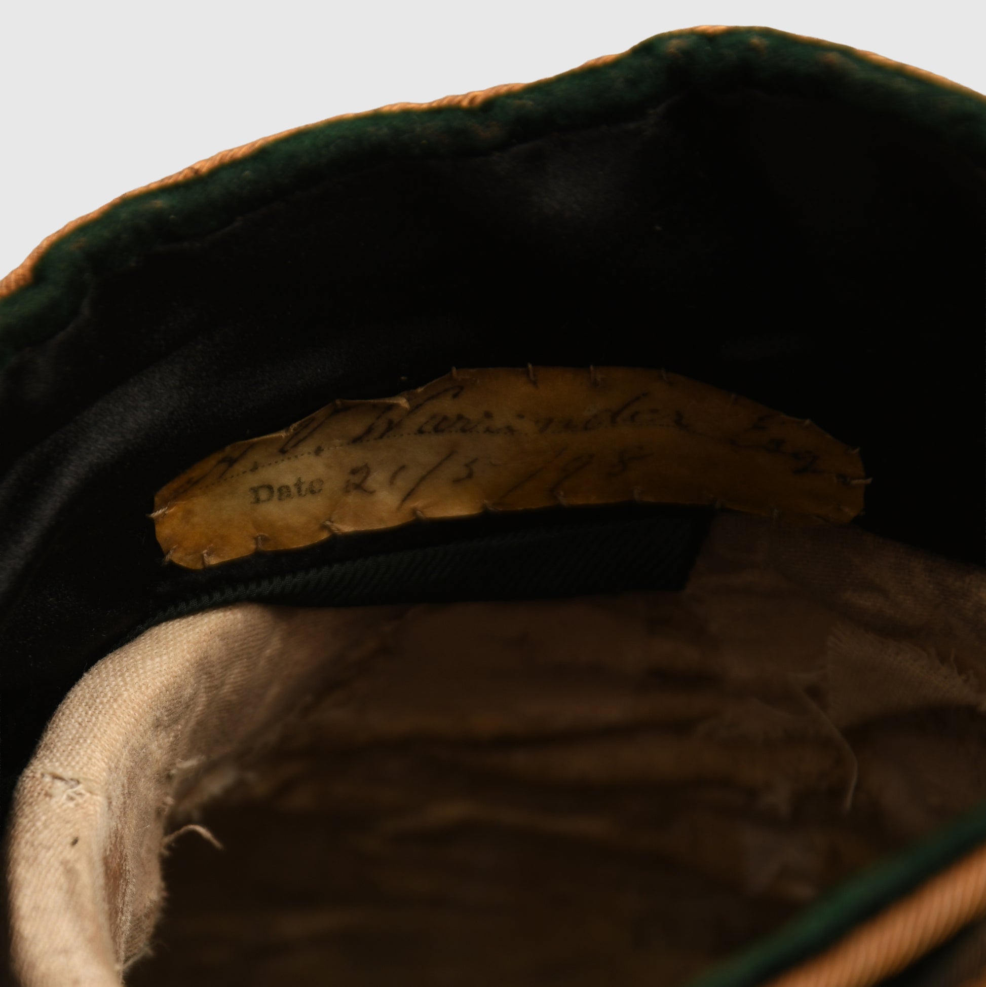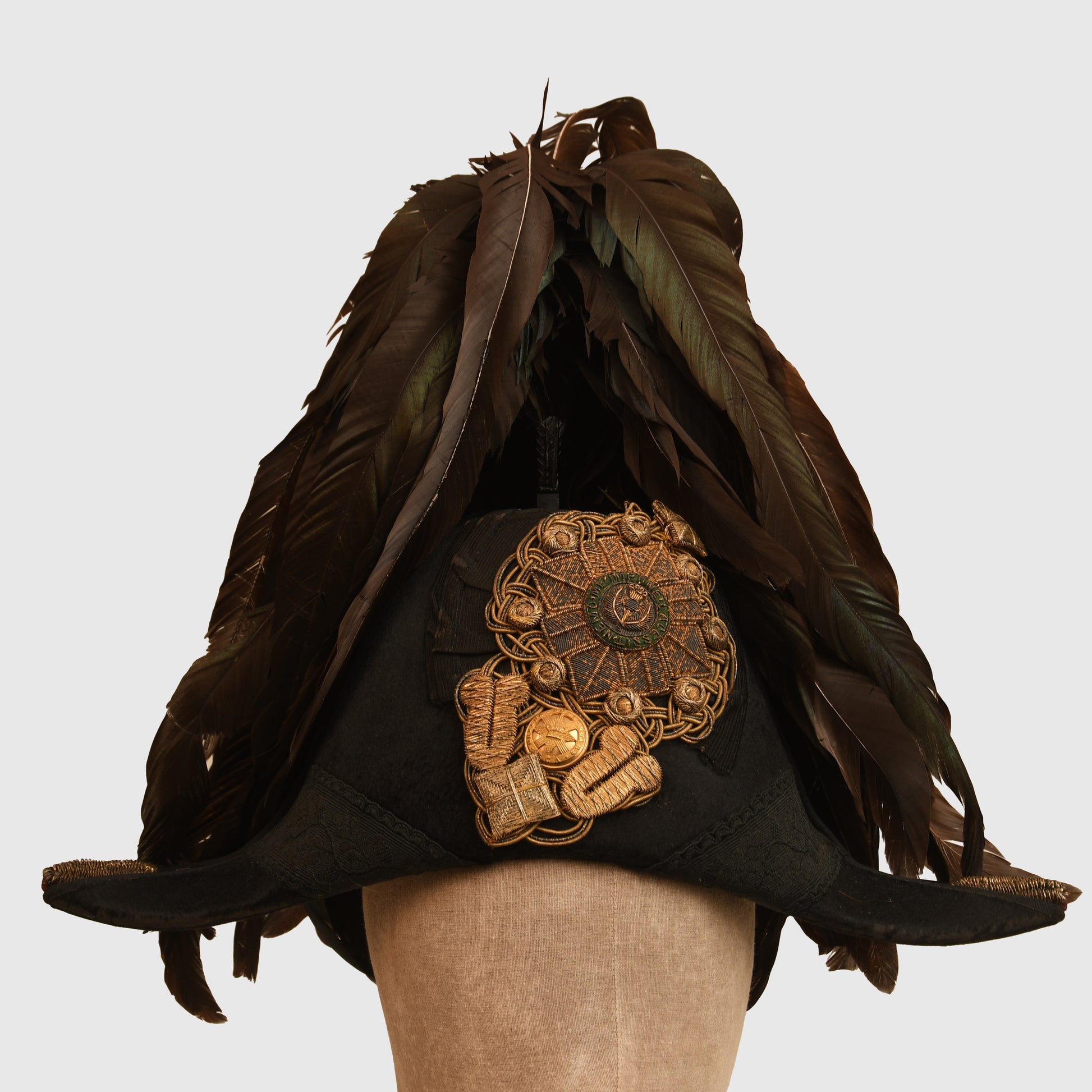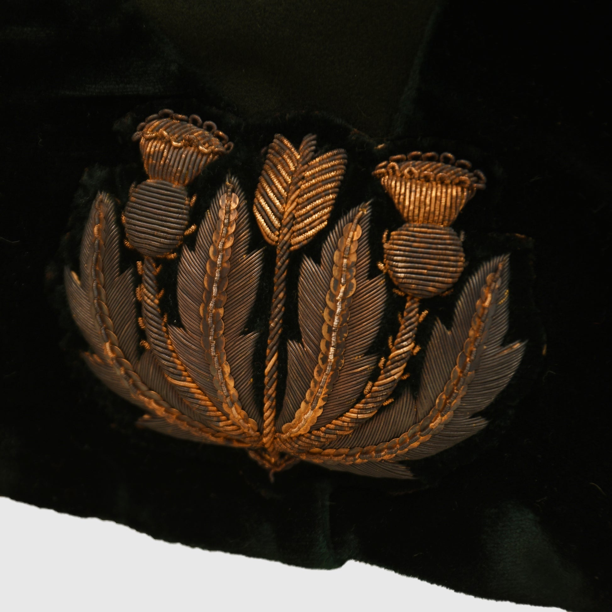 The uniform is constructed from magnificent green cloth and remains in exceptional condition, entirely free from moth damage. The set is headlined by the long tail coat, which features exquisite hand-embroidery on the collar, cuffs, and rear coat tails. The gilt finish on the Queen’s crown buttons is superb, as is the quality of the removable shoulder boards. A minor seam tear is noted between the left shoulder board and the collar when viewed from the front, though this does not detract from the overall display.