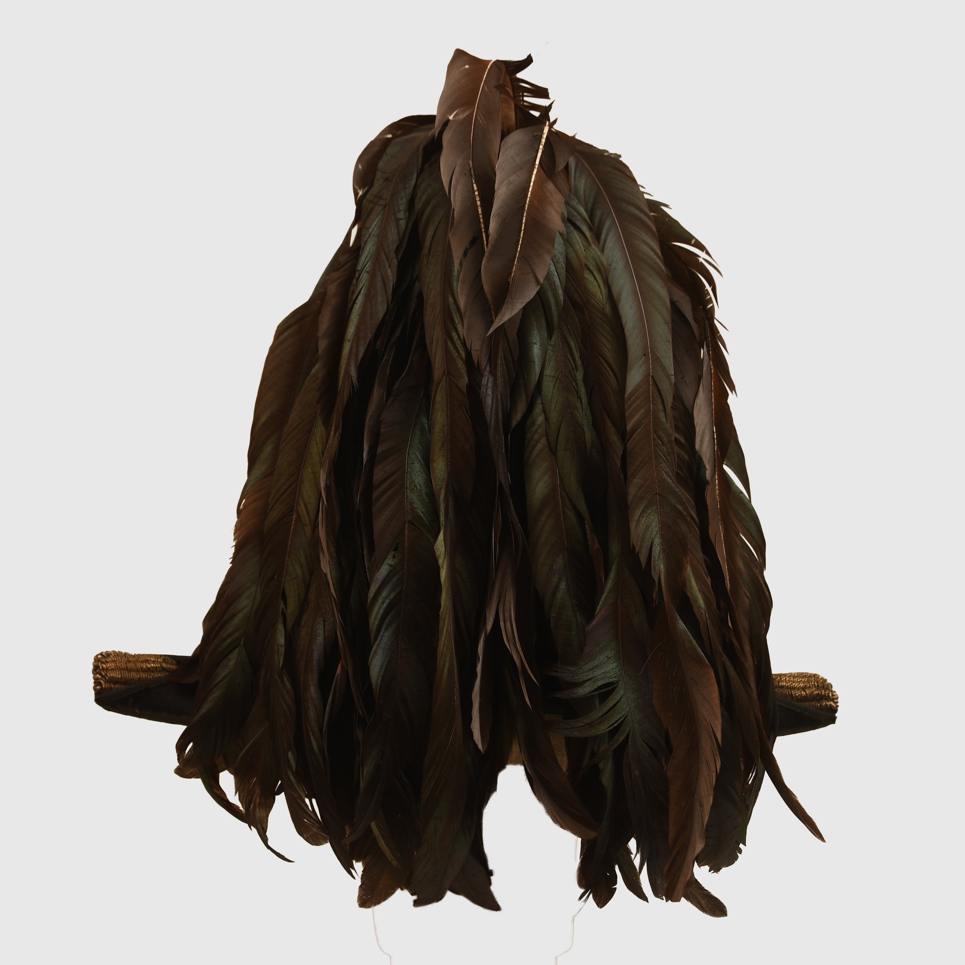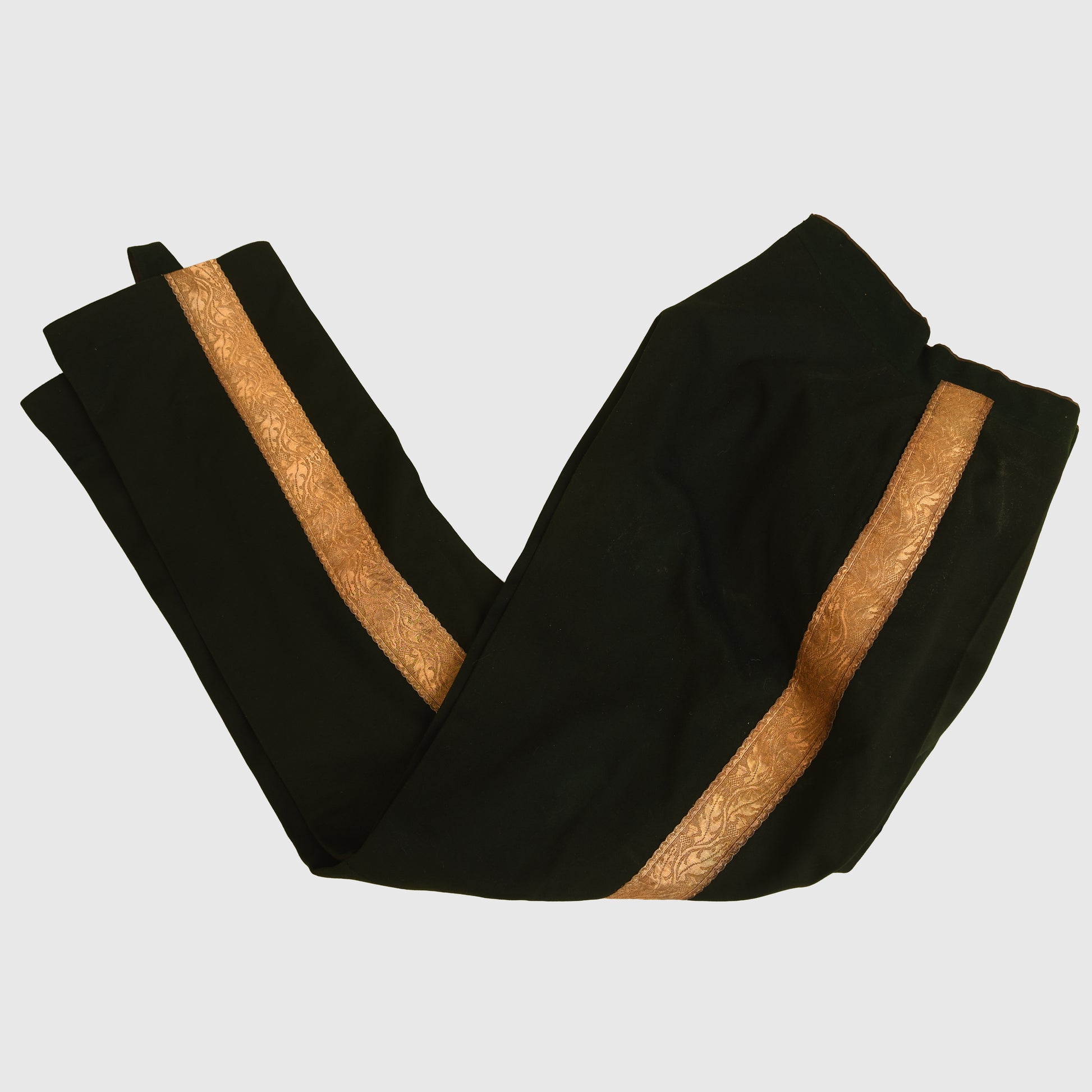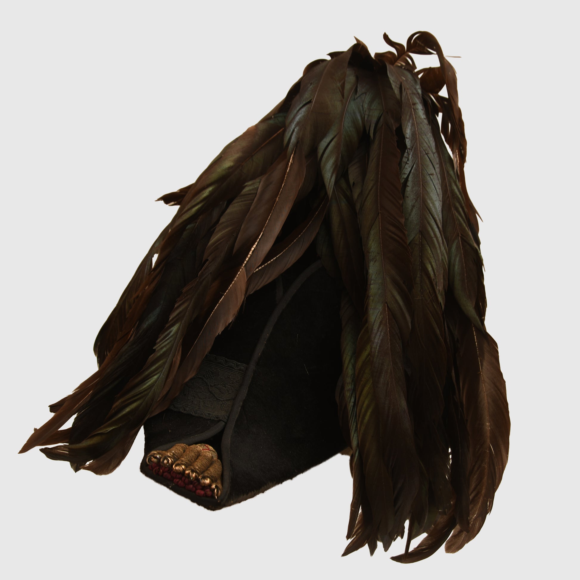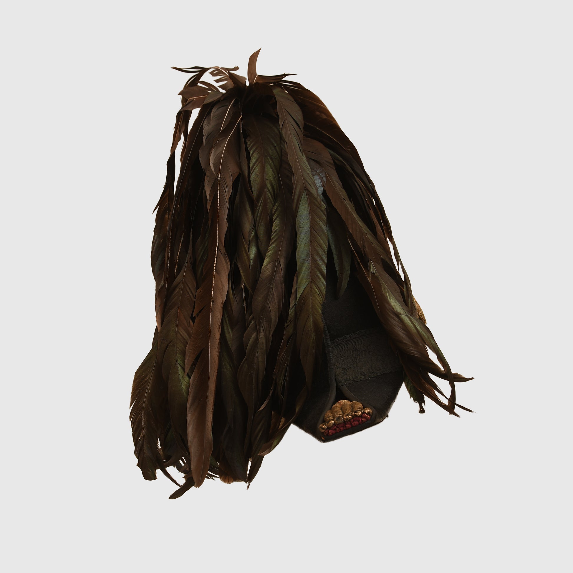 The uniform is constructed from magnificent green cloth and remains in exceptional condition, entirely free from moth damage. The set is headlined by the long tail coat, which features exquisite hand-embroidery on the collar, cuffs, and rear coat tails. The gilt finish on the Queen’s crown buttons is superb, as is the quality of the removable shoulder boards. A minor seam tear is noted between the left shoulder board and the collar when viewed from the front, though this does not detract from the overall display.