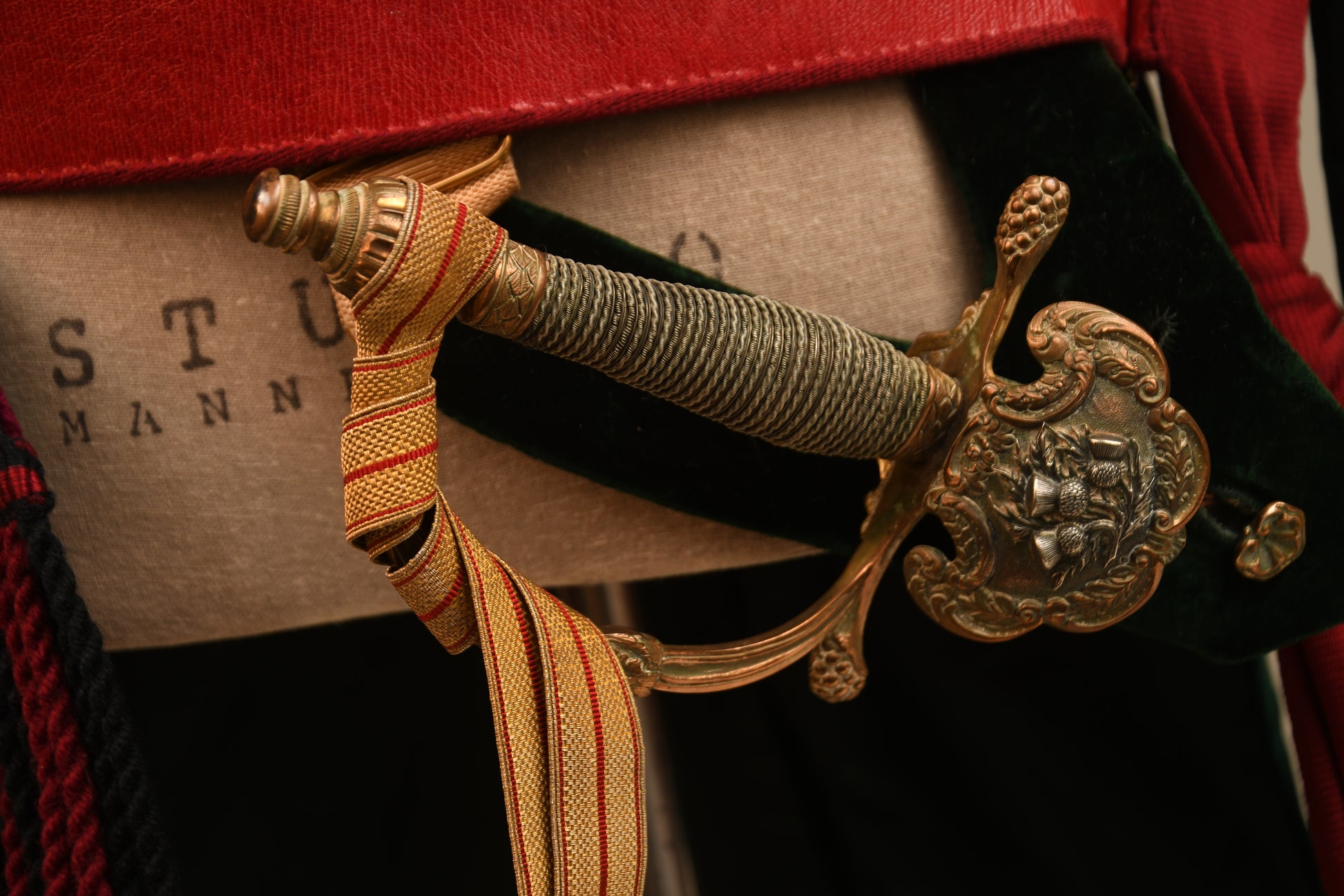Accompanying the tunic is the correct cocked hat, complete with a multi-embroidered Royal Company of Archers badge and a vibrant green plume. The ensemble includes the green sash featuring two company badges, a red sash, and the waist belt with a large, ornate belt plate. The weaponry and accoutrements are equally impressive, featuring a green velvet sword frog housing a complete sword in excellent condition. The bullion tassel is a highlight of the set, featuring a VR (Victoria Regina) scroll on the reverse.