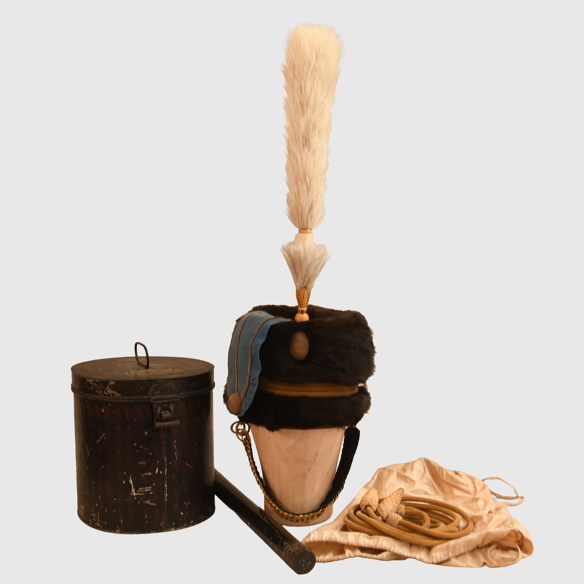 The busby is complete with its full suite of original accessories. This includes the correct long white plume and the specific Hussar pattern plume holder with its gilded ring. Also present are the protective carrying bag, a long set of cap lines, the original plume tube, and the beautifully gilded, leather and velvet-lined chin chain. The storage tin features a Captain Watson label and the Hamburger and Sons metal maker's plate on the exterior.