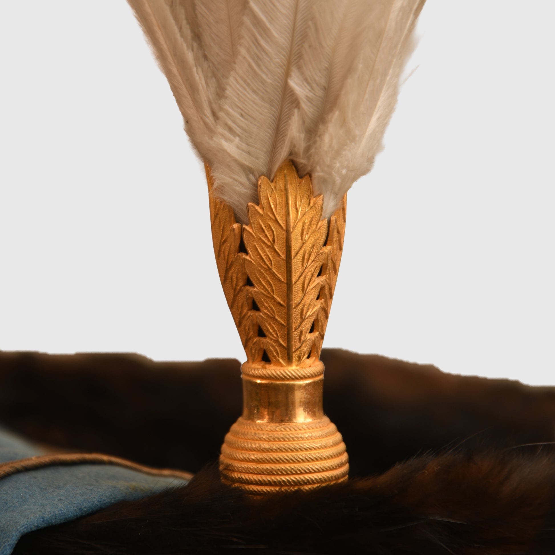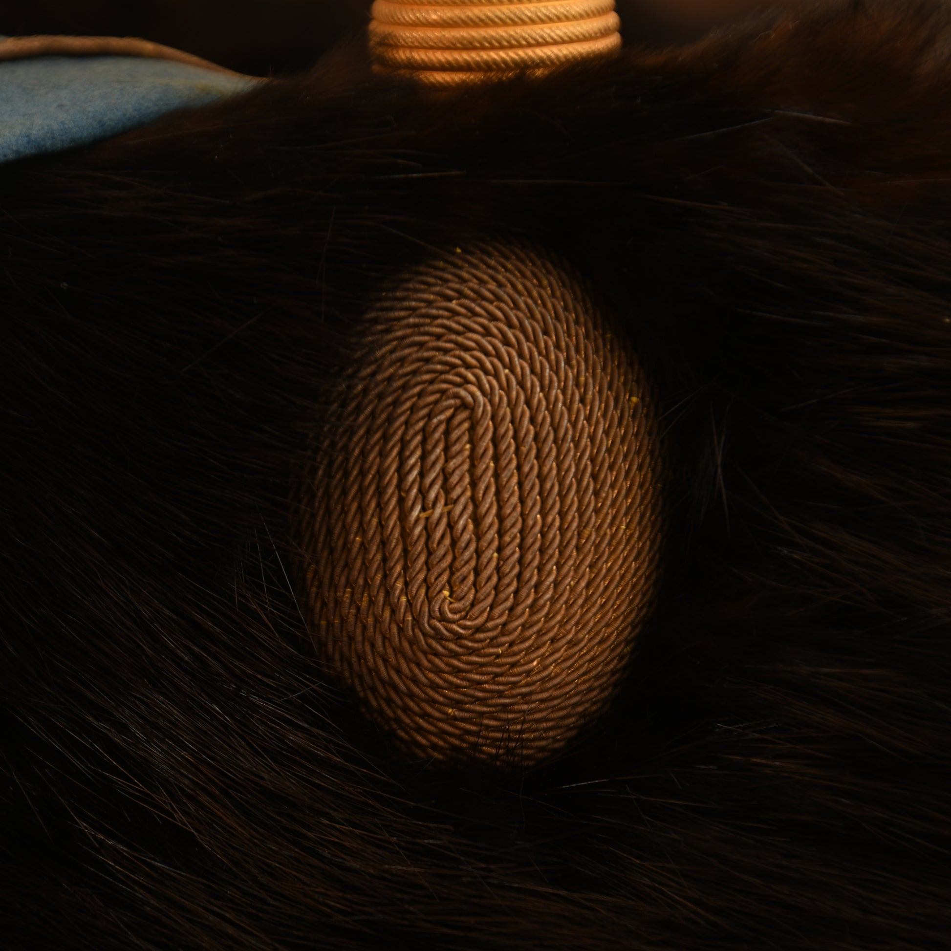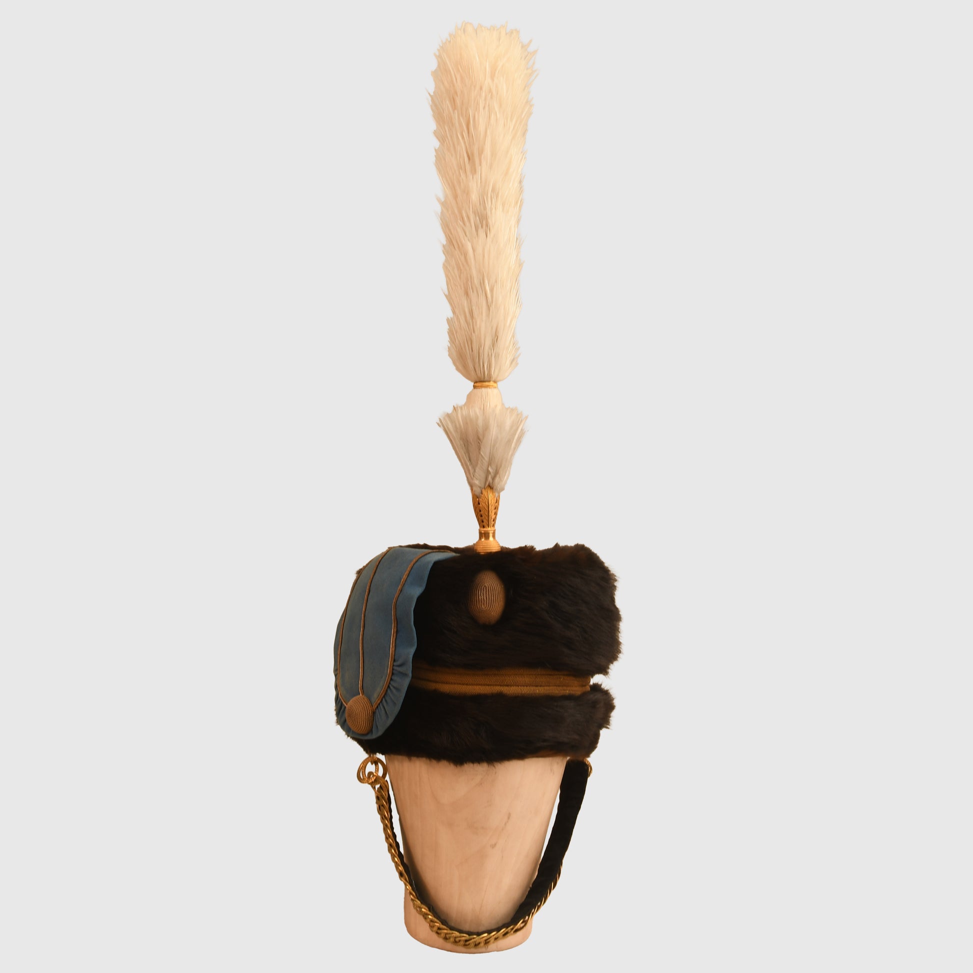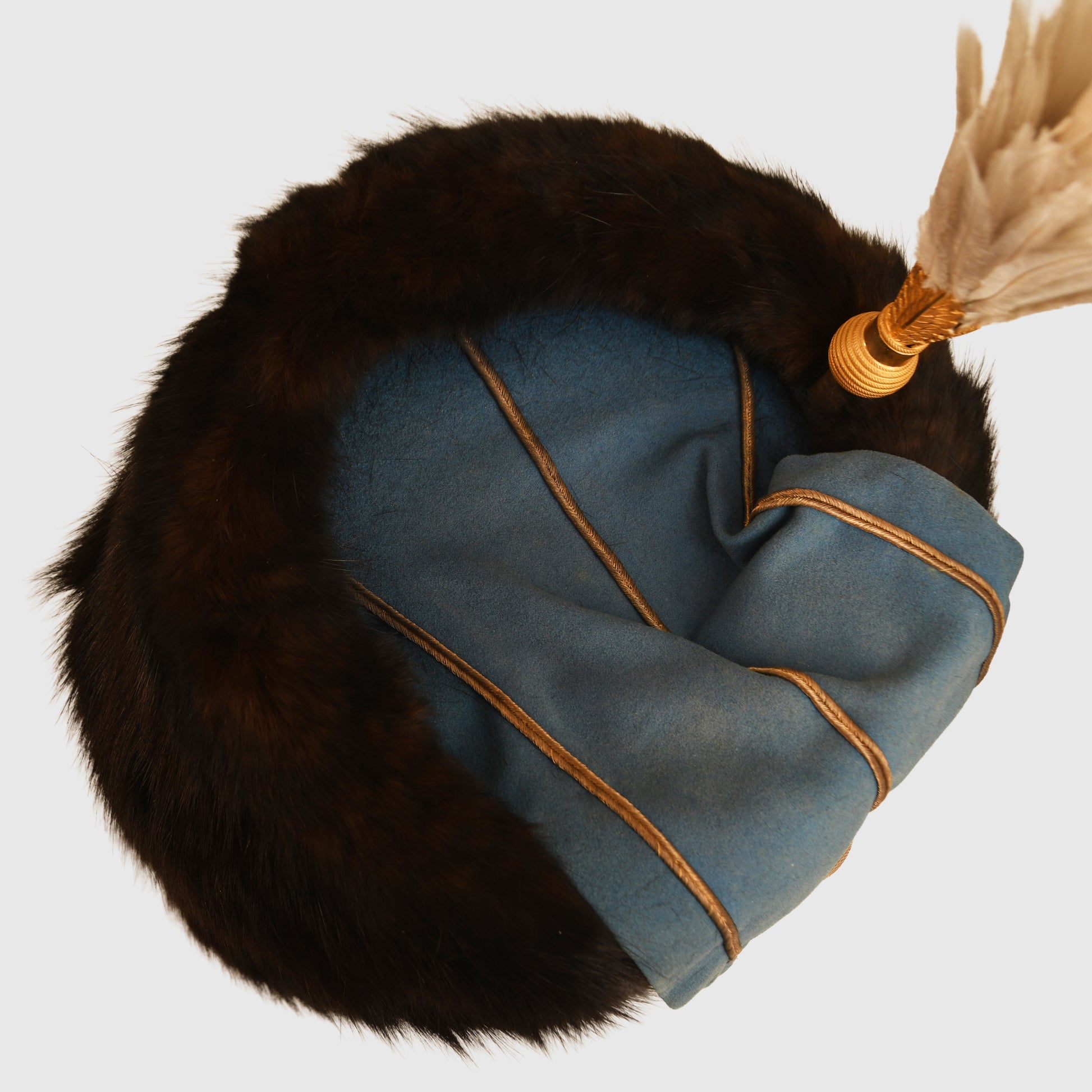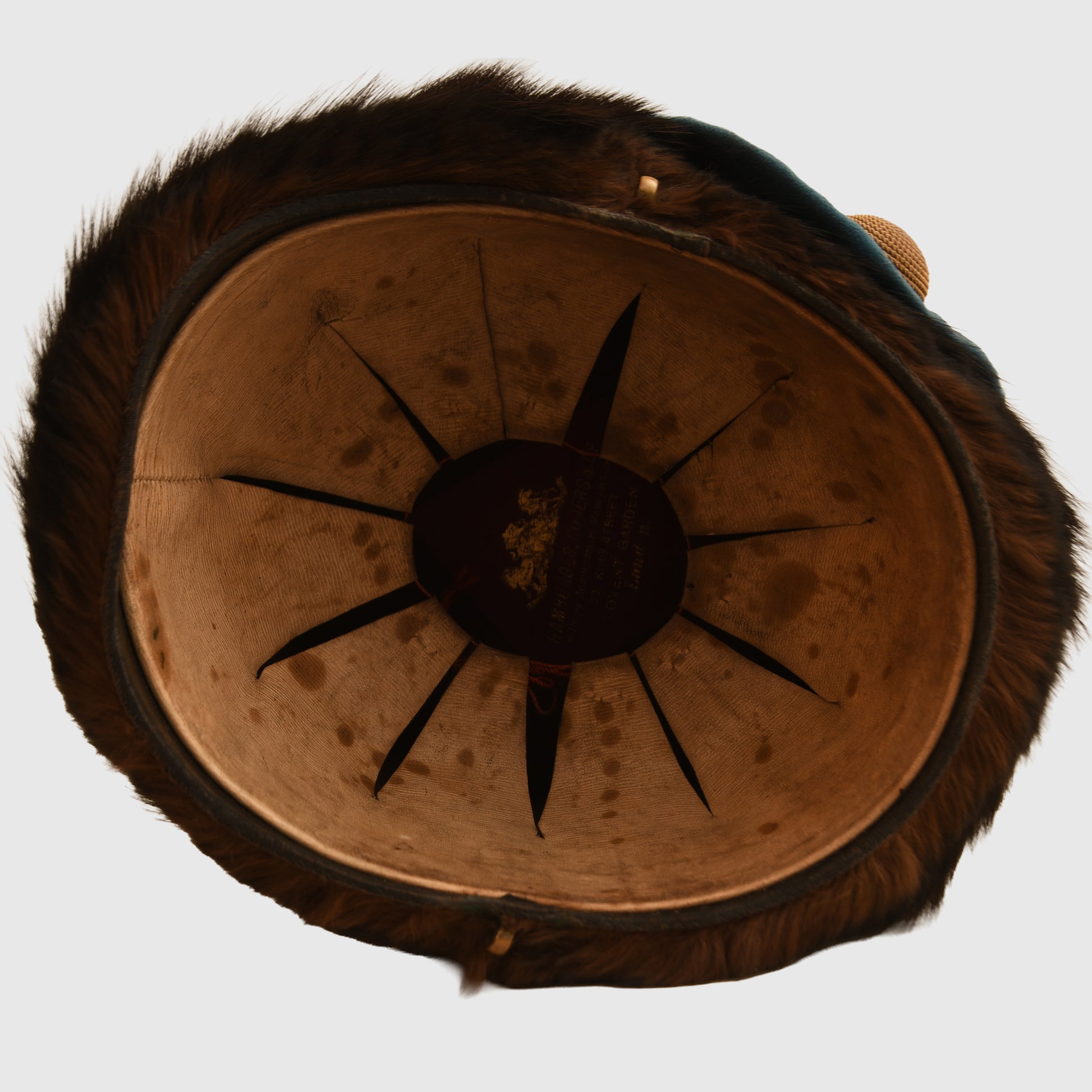 The quality of the fur is absolutely superb, retaining its original depth and texture. The blue busby bag is accented with gold trim and remains entirely free from moth damage. It is correctly fitted with a gilded wire woven cockade and ornate cap lines wrapped around the centre of the busby. The interior is equally impressive, featuring a white Morocco leather liner with its original drawstring. While there is some natural age toning to the white leather, it remains intact. The upper inner crown bears the beautiful gilt maker’s logo of Hamburger Rogers and Company, King Street, Covent Garden, London.
