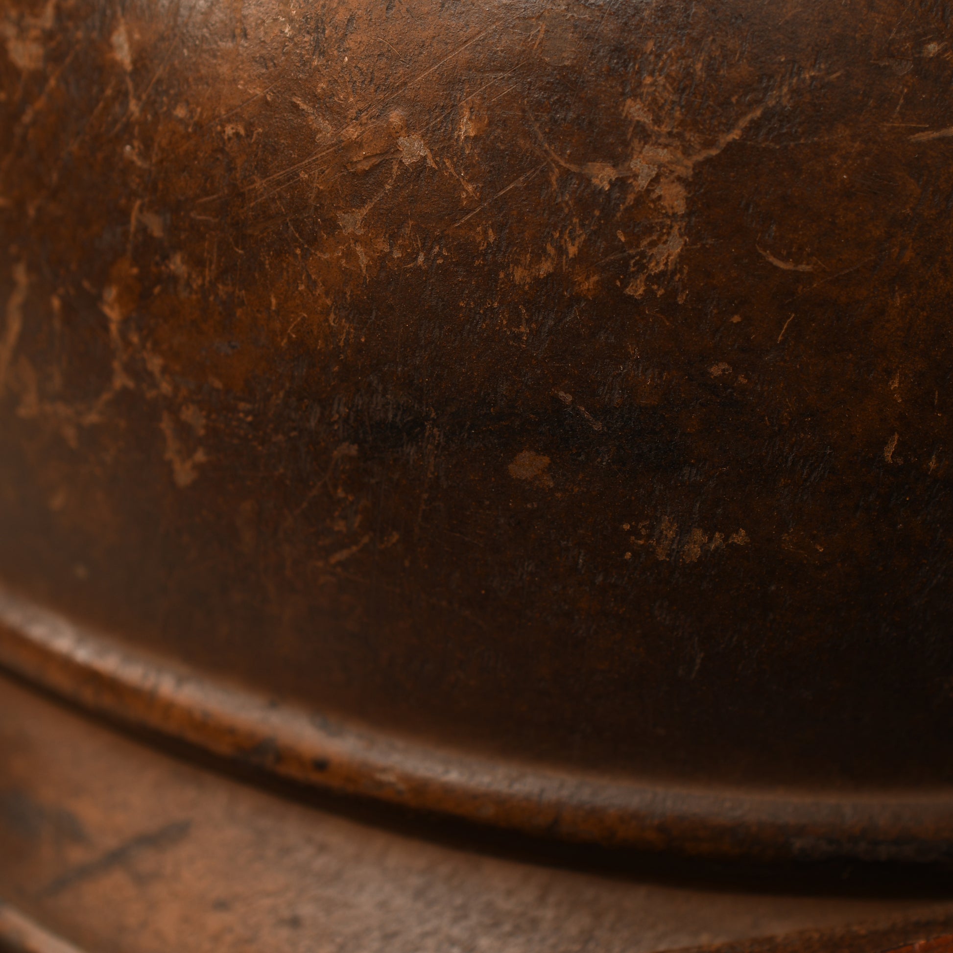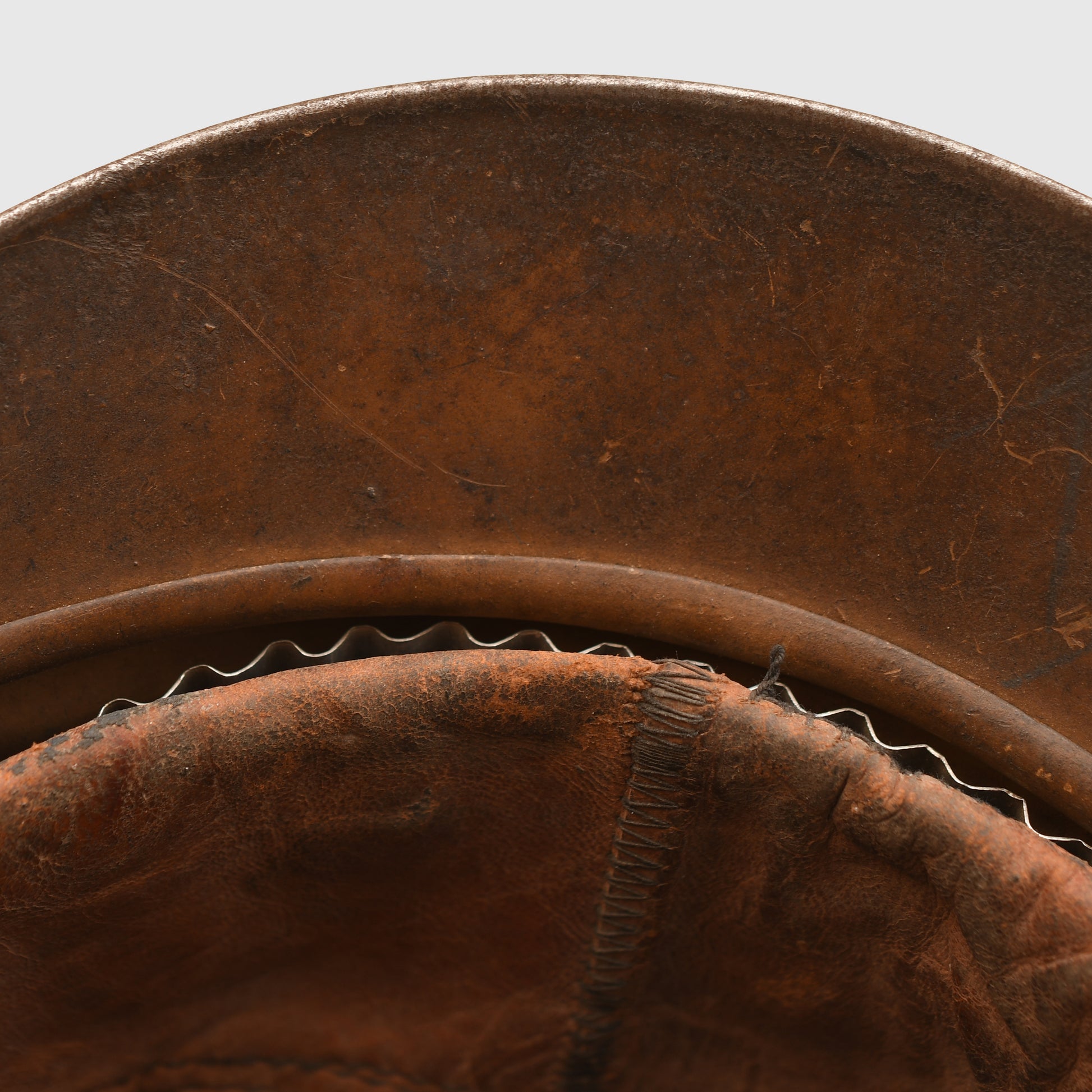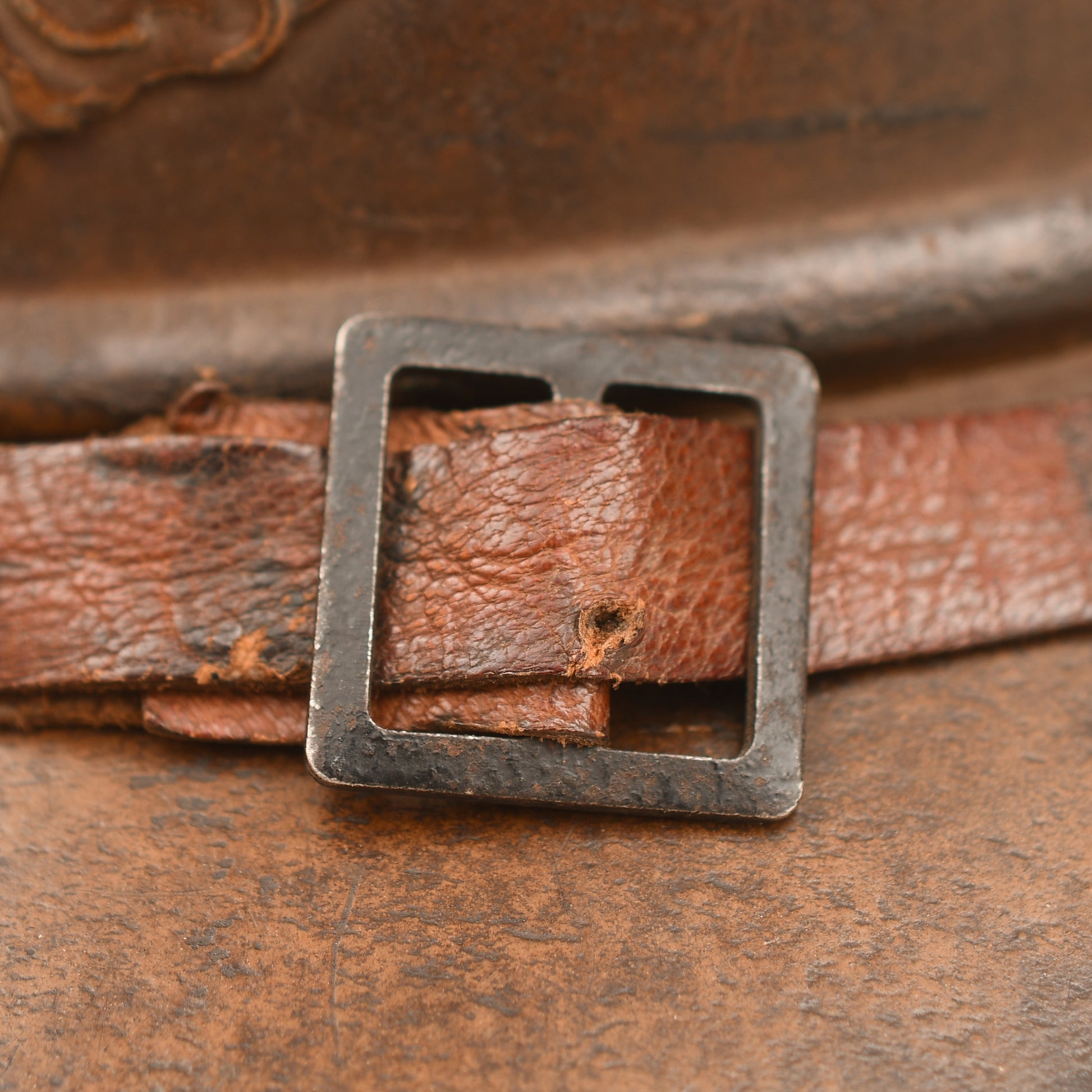 The interior is complete with its brown and black leather liner, featuring all tongues and the original drawstring. The helmet is also complete with its original leather chinstrap. Large-sized examples of the Russian-issue Adrian are increasingly difficult to locate, especially when found with original badges and internal components intact. This is a primary piece of Imperial Russian headgear from the Great War period.