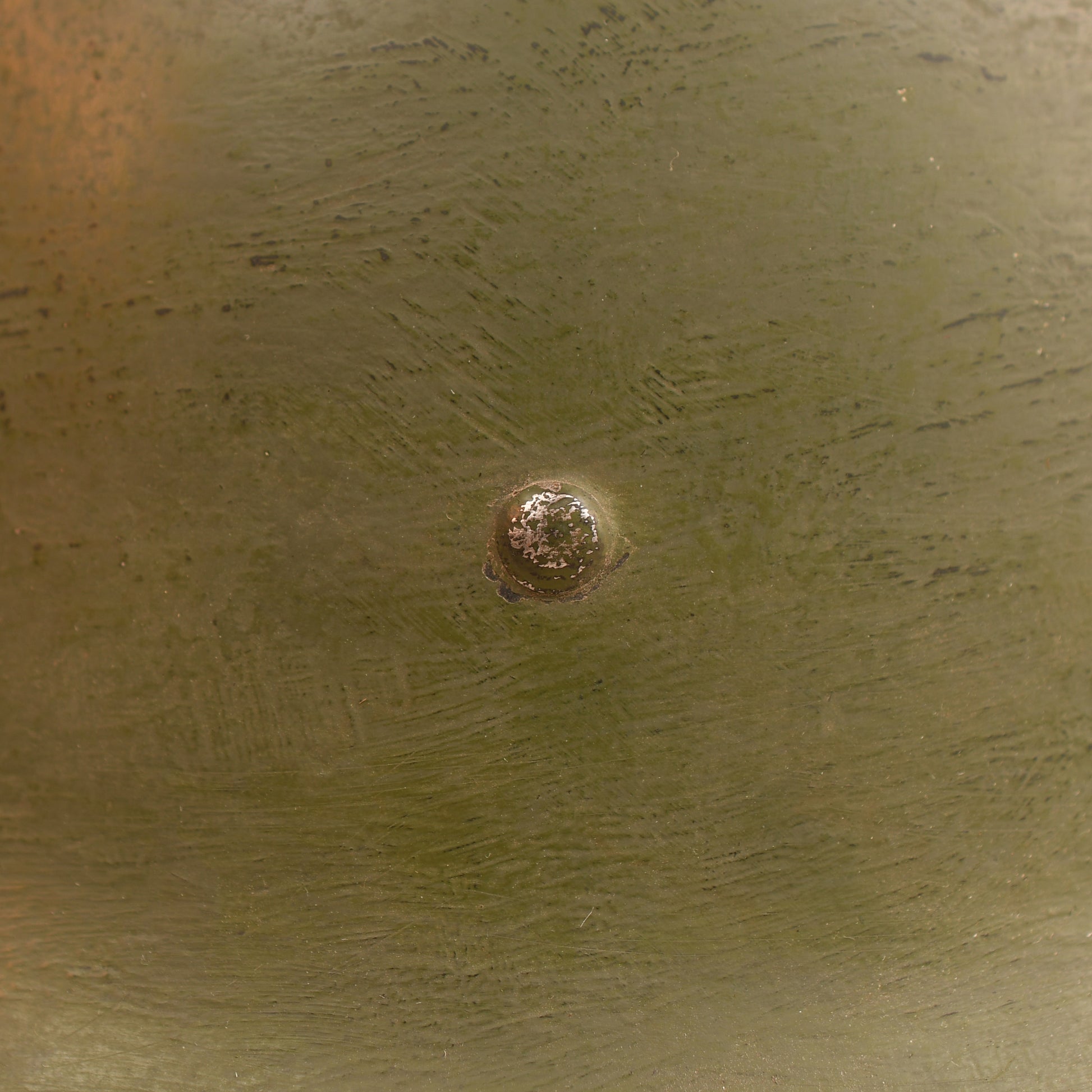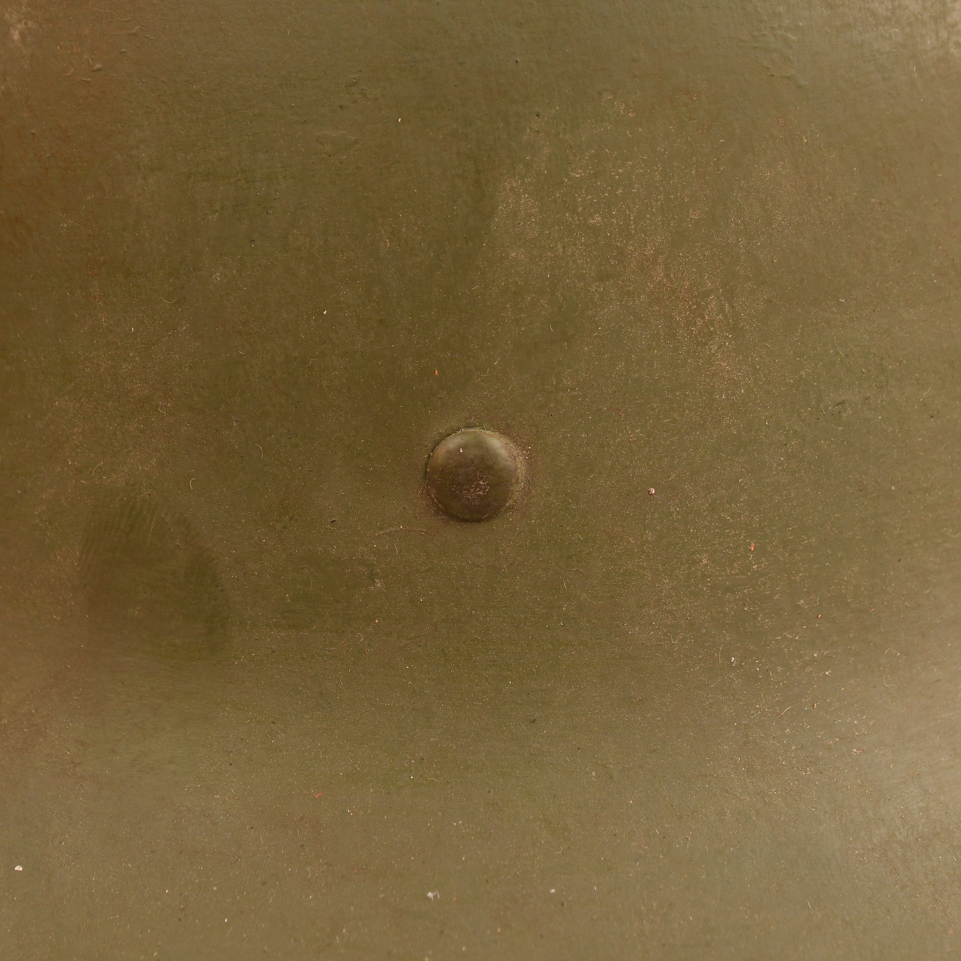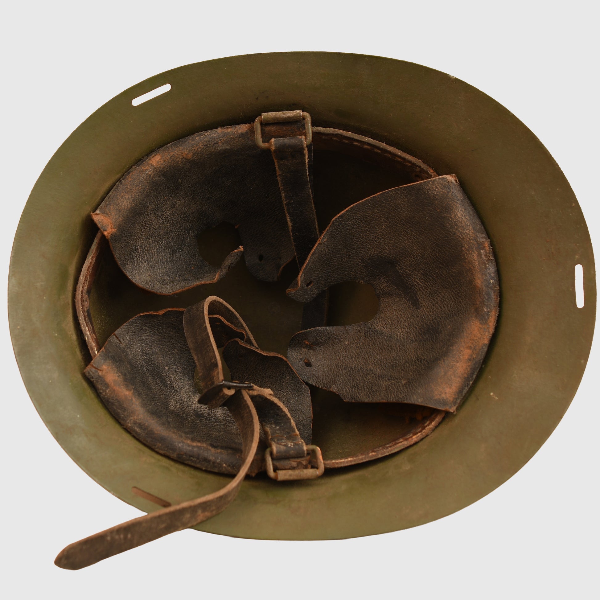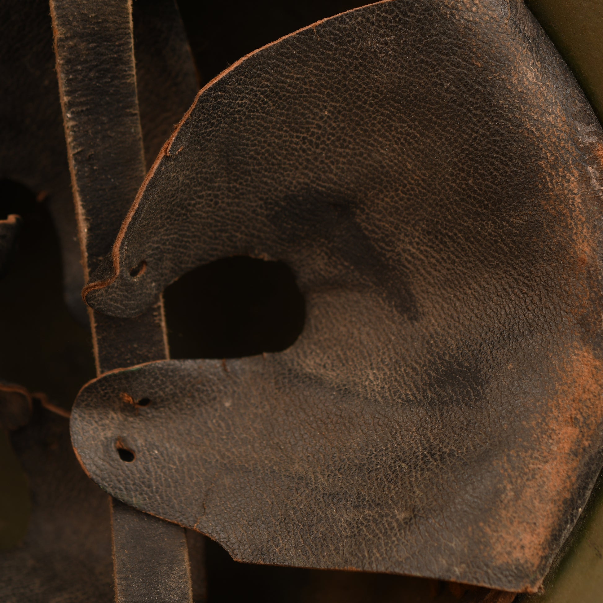 An exceptionally rare World War I Dutch M.15 helmet, beautifully preserved with all of its original paint finish intact. The three-pad liner is complete, including the original felt inserts behind the leather, and it retains the original black leather chinstrap. A superb example of this elusive early 20th-century combat helmet.